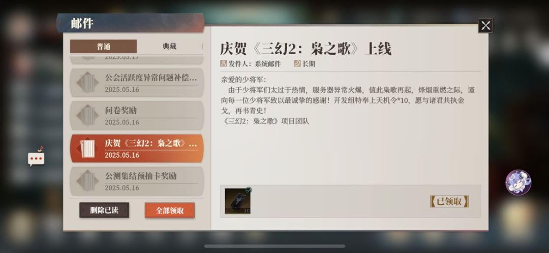 我们再发送【天机令*10】,也已在昨日通过游戏内邮件发放,少将军们记得领取哦!