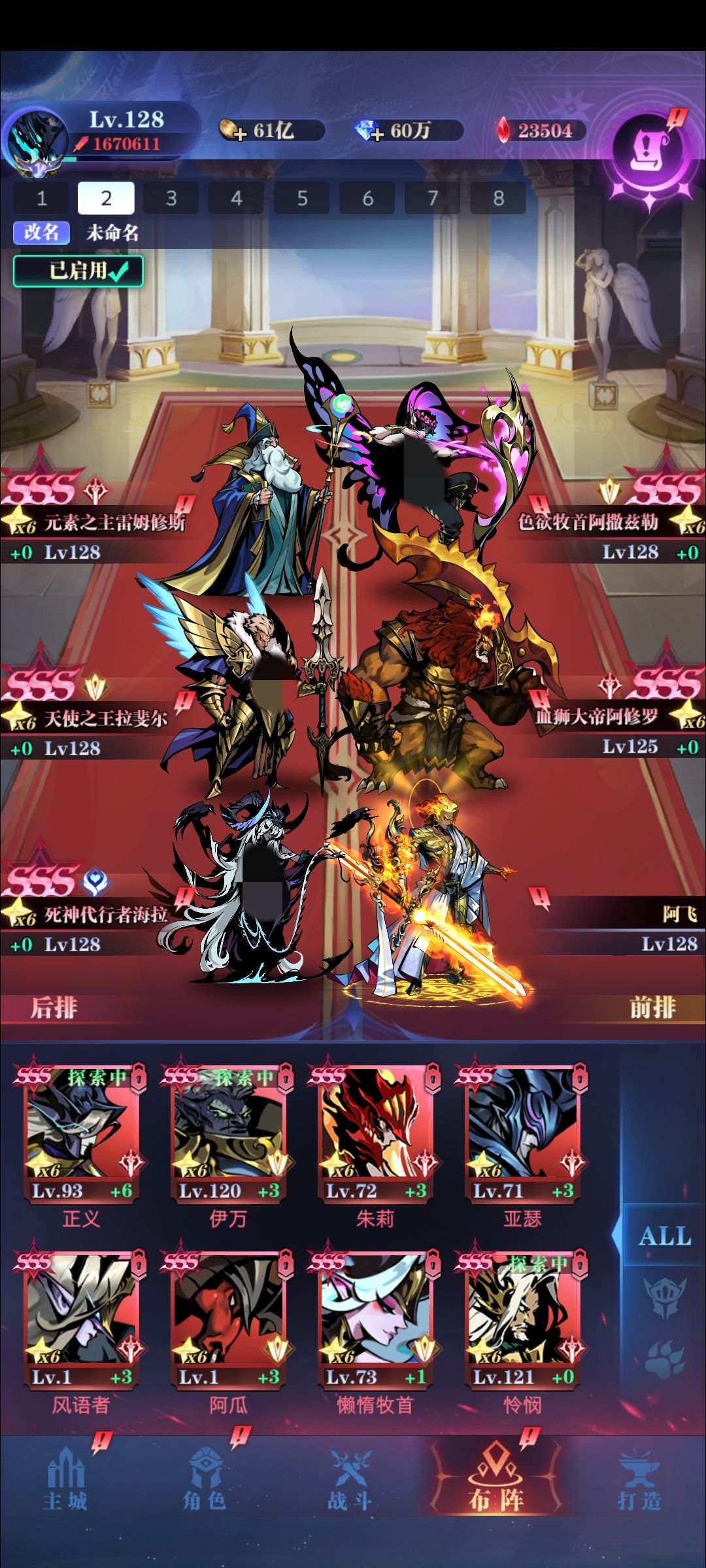 血狮,天使,海拉,色欲,元素,恶魔大祭司艾尔温,悠悠等。这些卡抽到后用5张ss把sss升到6星并解锁4羁绊,血狮只强化技能和物攻(其他先锁住根据推图需求调整数值),天使开4羁绊但不强化,其他卡开4羁绊全强化。
