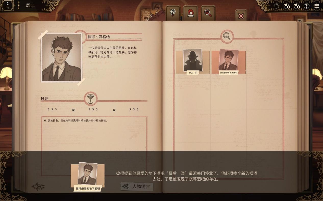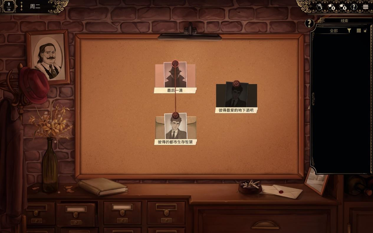 当玩家服务完所有的顾客后就可以摇铃结束一天的营业了(或者你想的话,直接摇铃结束也是可以的)。此时就会进入推理环节(我也不知道为什么一个酒保会干这么侦探的事情),玩家搜集到的线索都会钉在板子上,玩家可以通过在两个线索之间连线来推理出新的线索,进而尝试还原整个事件的全貌。