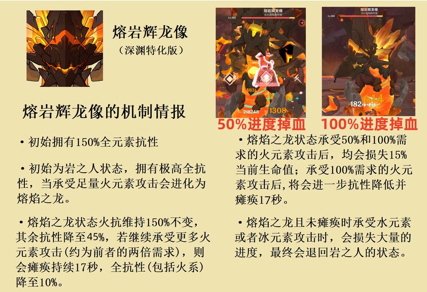 · 【12层下半:机制解析】主要的难点还是在下路,如果不懂机制,没安排好角色,真就是非常的难打。下路地脉异常给的75%的草伤加成。12-1下路熔岩辉龙像,这个怪物有个误导,有点像火螃蟹,拾柒就下意识的用水去打,结果就是我18个金造价的妮露水草队跟刮痧一样。后来在粉丝的提醒下,我才知道这个怪物是机制怪,机制存在期间会有很高的全元素抗性,而且不能用水、冰角色打,否则无法破除防御机制。正确的做法是用火元素角色打,当怪物旁边这个红色圆圈打满两次之后,怪物就会瘫痪倒地,实际上不是很难,用纯火队,火草队、超载队都能打。