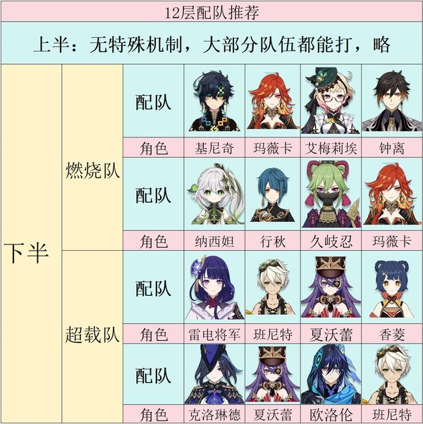 · 【总结:打法核心思路】总结一下,12层上半没难度,力大砖飞即可。12层下半的话,主要考虑火元素相关队伍,不要用水、冰角色,用纯火、燃烧、超载破12-1机制。后面两层注意用频繁输出的角色破盾即可,不难,主要就是机制怪。