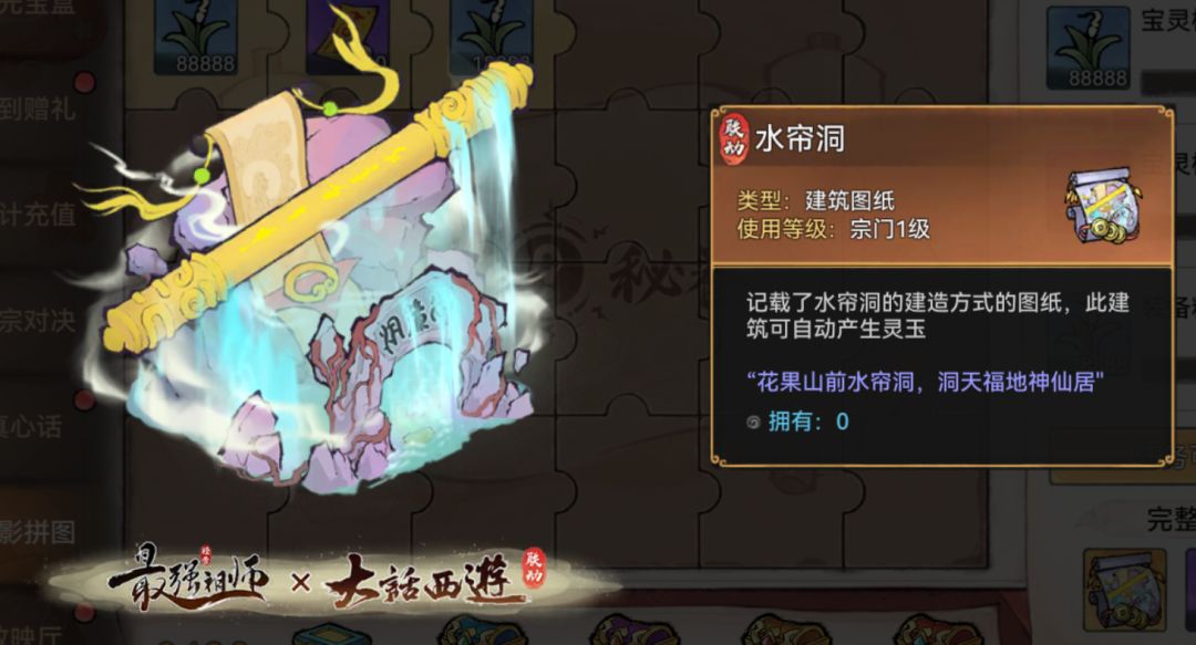 累计完成一定数量的任务或是完成整张拼图还可获得建筑图纸-水帘洞、寻仙令等奖励。