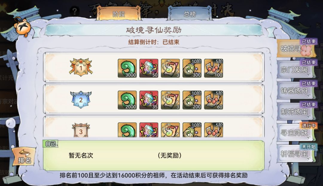 在每个比拼阶段,祖师获得的积分达到一定数量后,即可解锁无字天书、星尘石英等目标奖励。