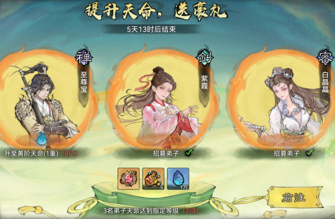 将联动弟子的天命提升至指定等级,不仅可以免费领取寻仙令、灵玉等奖励,还可以购买直购礼包,获取全新功法渡厄真经、心缘剑诀、九幽镇狱掌。