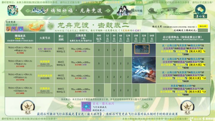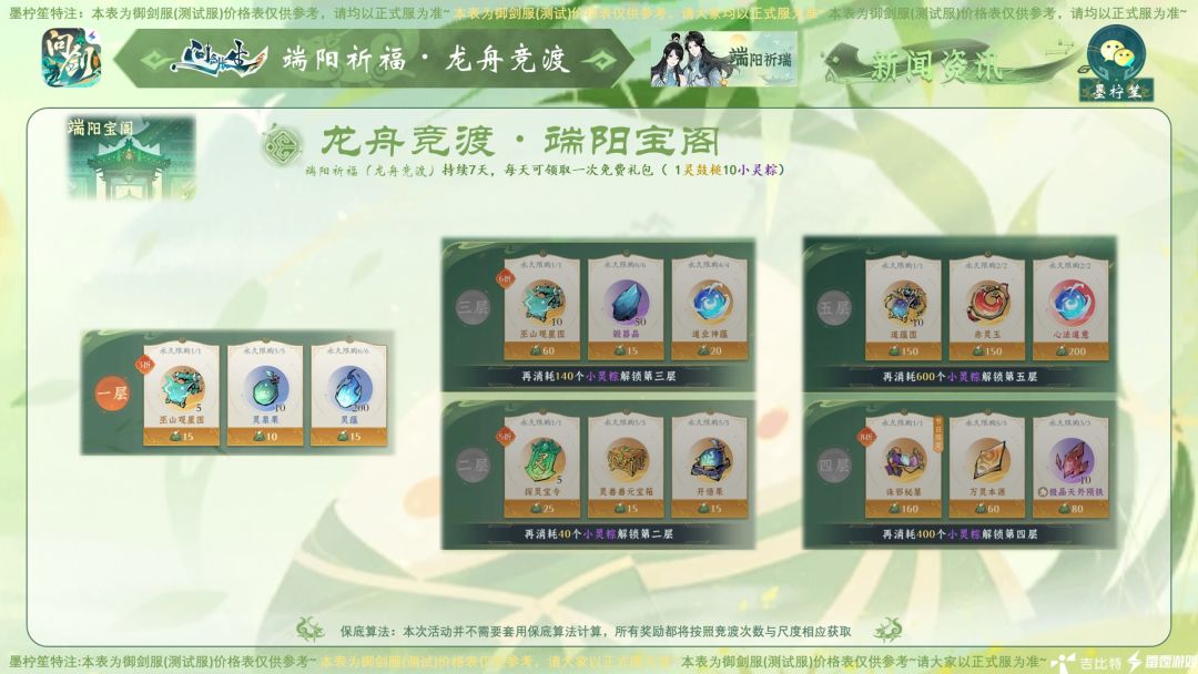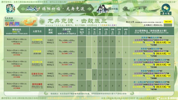 大家好,今日新活动的数据已经统计完毕喽,为大家带来问剑长生最新活动,预计正式服将在端午节前后上线的“端阳祈福”活动!以上是各节点价格表,所需的物资可以参考攻略图哦~