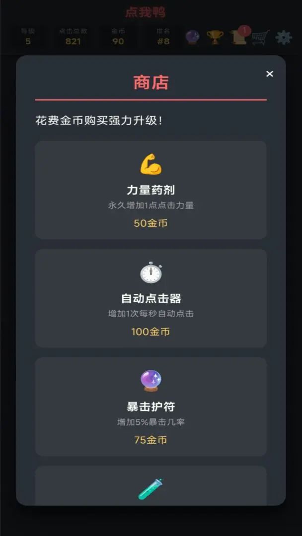 🌋游戏介绍:《点我鸭》是一款像素风格的休闲单机模拟养成游戏。游戏以一只可爱的黄色小鸭子为核心,玩家通过不断点击屏幕操控小鸭子,开启一场充满趣味的养成之旅。