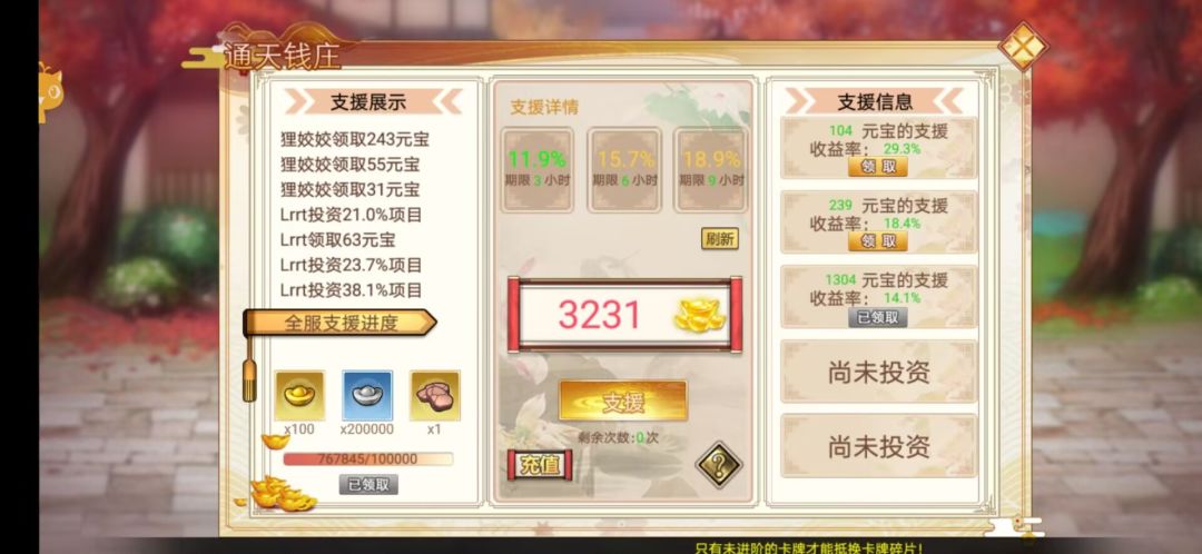 ●通天钱庄,玩法很简单,就是银行,百分比是利率,下边的时间统一选择9小时(银行嘛,当然是存的久给的多啦),刚进去全是零,刷新利率跟本金就出来了,刷新是要收元宝的,不熟悉就别乱刷了,容易亏。