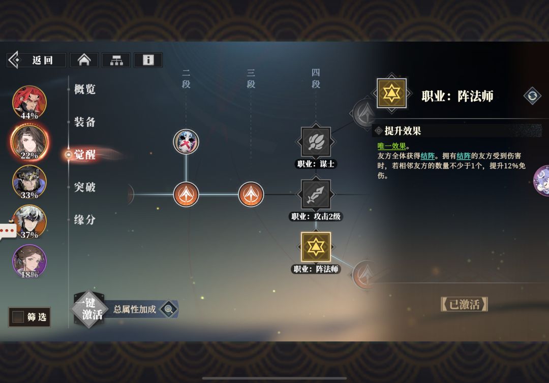 郭嘉转职为阵法师加上其本身的万金油特性 很好的补充队伍内的输出和续航。