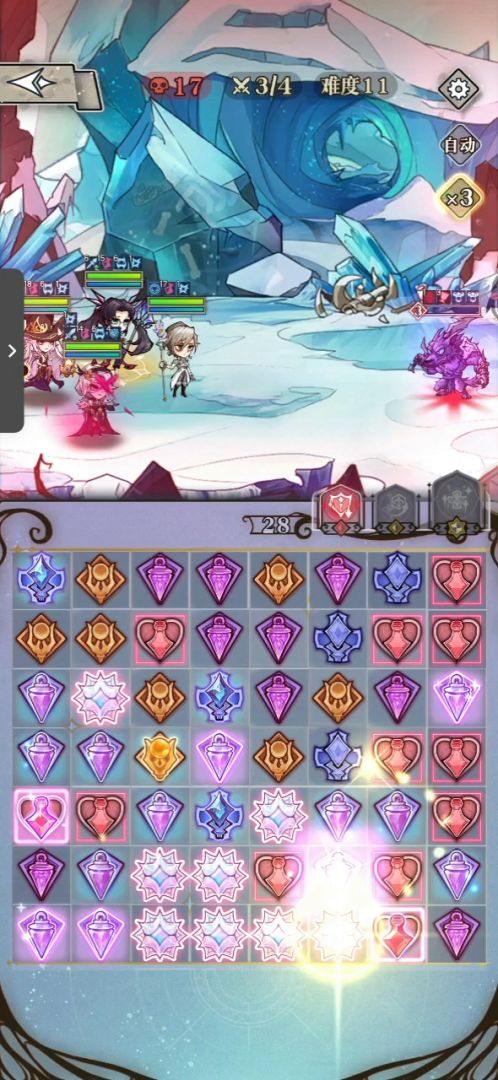 小怪关前两关利用黛博拉拖回合攒5连(因为菲洛米娜·埃文斯小技能输出很低,清小怪很慢,更加适合拖回合),然后在第三关攒菲洛米娜的普通技能和强化技能符石,符石之间用红色的治疗符石隔开,这样时之魔女开大时就能一次性消除很多菲洛米娜技能符石,叠出大量梦蚀debuff,在第三关最后一个小怪剩余血量不多时先放t的普通或者强化技能和日中炎精再放双大招(保证黛博拉和菲洛米娜能打死就可以),有时钟之王的话卡一下回合数,保证boss能吃到时钟之王debuff,进入boss关,技能动画结束后,大退游戏重新进入,连续2-3个双大招带走狼王。