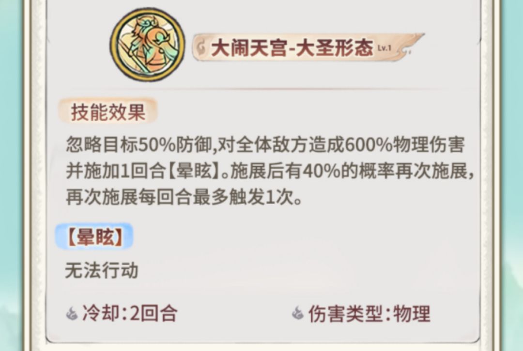大圣技能为600%倍率,且忽略目标50%防御,注意一下这个倍率是攻击倍率,比如韩立道兵上的数值描述,只有明确说明是防御倍率才是防御,然后有40%施展第二次,吃满都赶上韩立满星道兵的倍率了,且CD仅2回合,较为高频,可以说非常离谱。![[表情_惊恐]](https://img.tapimg.com/market/images/48b4972c071bcb2f7aa4090588ef01a8.png)