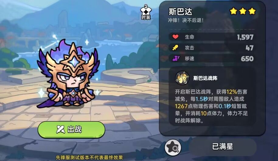 开启斯巴达战阵,获得12%伤害减免,每1.5秒对周围敌人造成1267点物理伤害和0.1秒短暂晕,并消耗10点体力,体力不足时战阵解除。