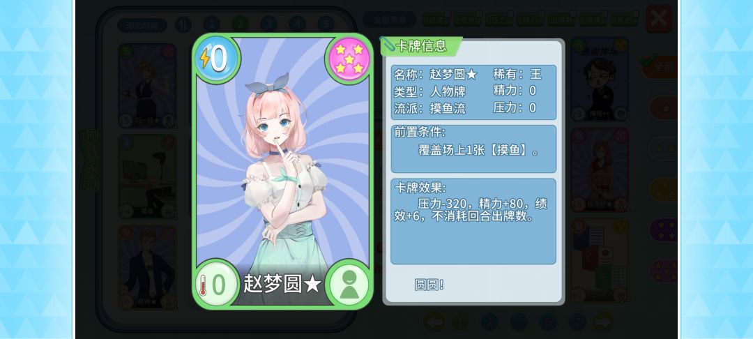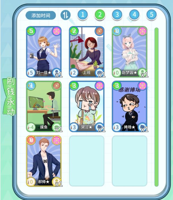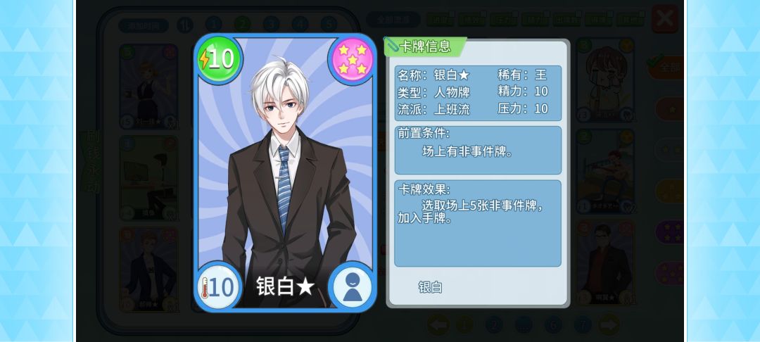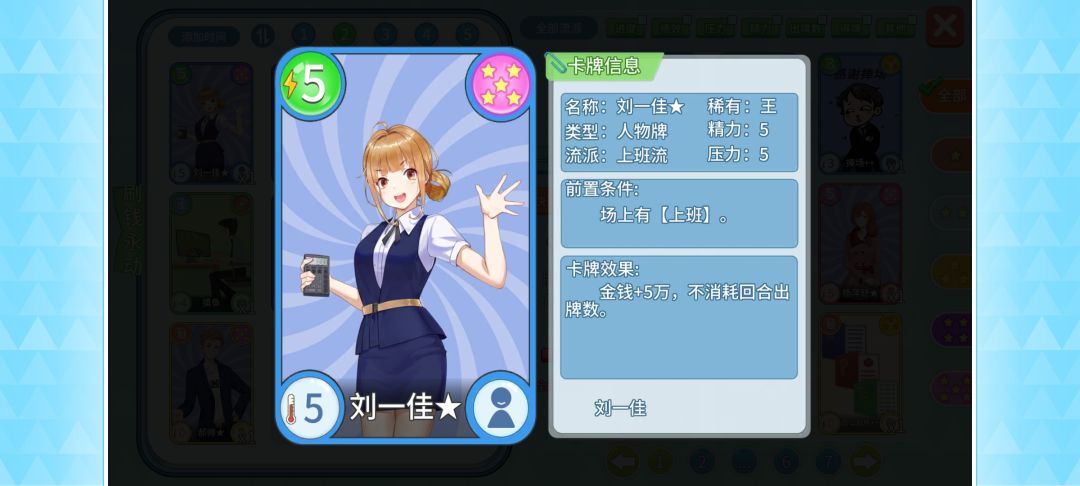 “捧场”需要三张上班流卡片,正好拉“上班”,“刘一佳”,“银白”回手卡;