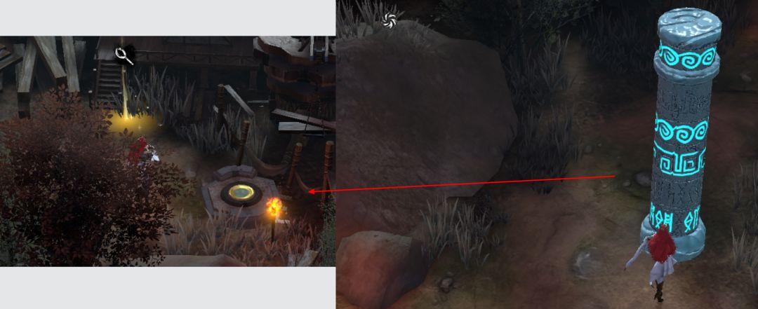 其实这个需要用到地图中的柱子,你会发现地图总共有三根柱子、三个传送阵,所以一个柱子对应一个传送阵,以刚进地图的柱子为例介绍柱子怎么旋转,离第一根柱子最近的传送点在该柱子的左侧,所以我们将柱子旋转到西边,然后就可以互动传送阵传送了。