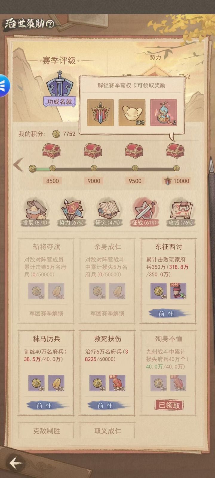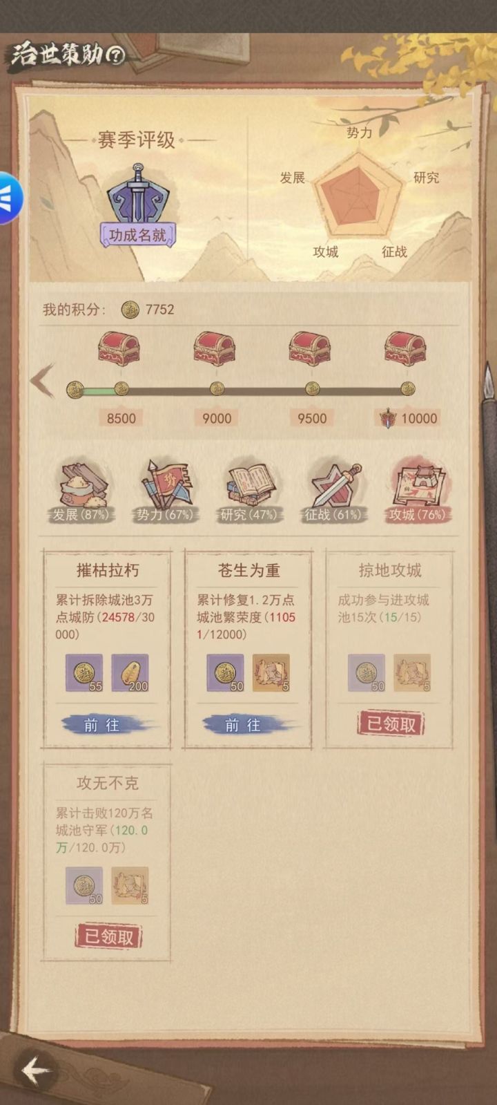 在《这城有良田》中,“治世策勋”是玩家快速提升实力的核心系统,通过完成五大板块任务获取积分,兑换丰厚奖励。赛季末冲刺阶段,合理规划任务优先级与协作策略至关重要。以下为高效冲分指南: