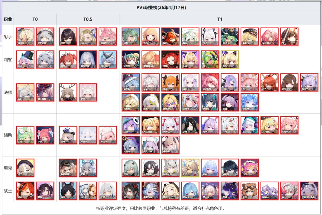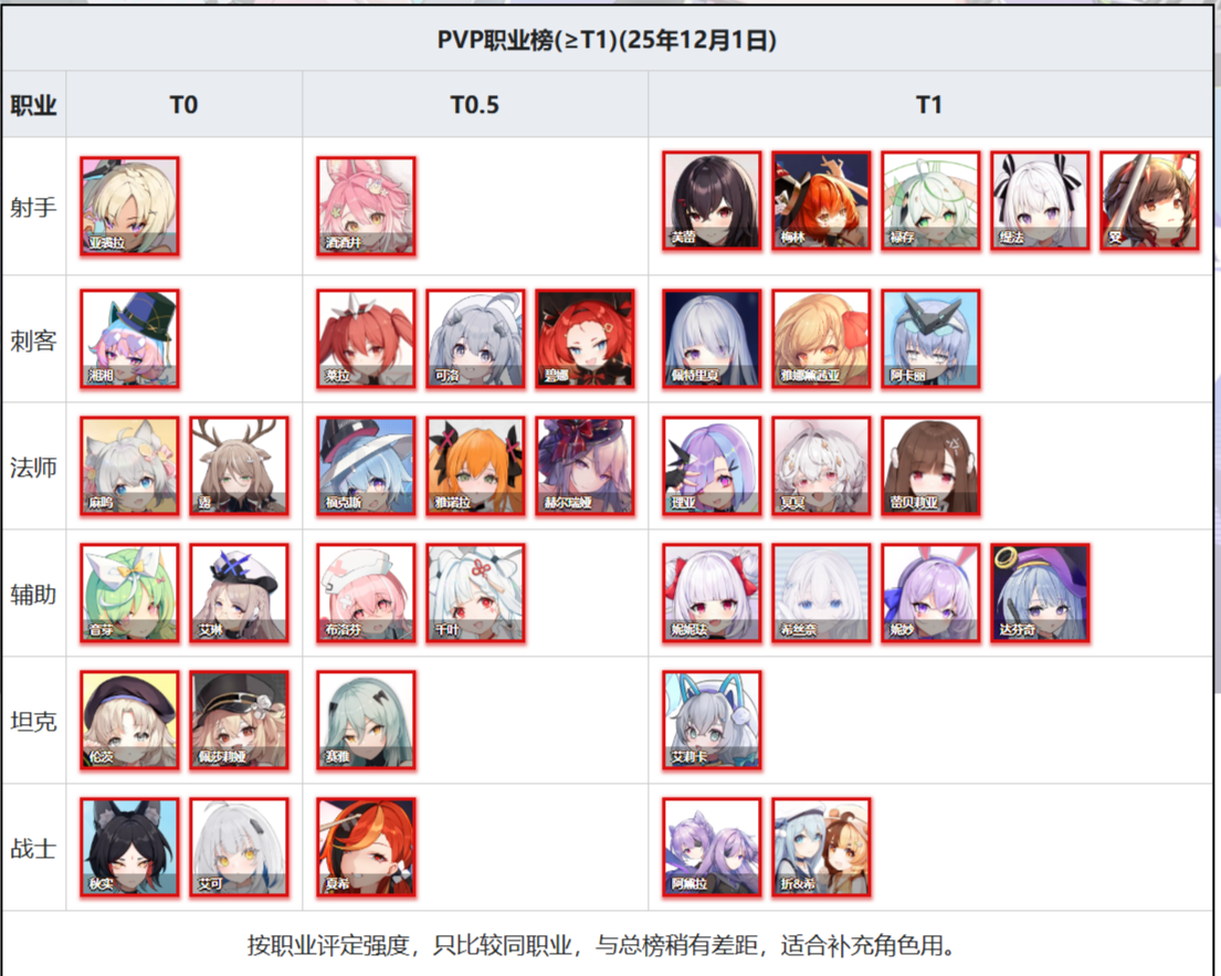 按职业评定强度,只比较同职业,与总榜稍有差距,适合补充角色用。