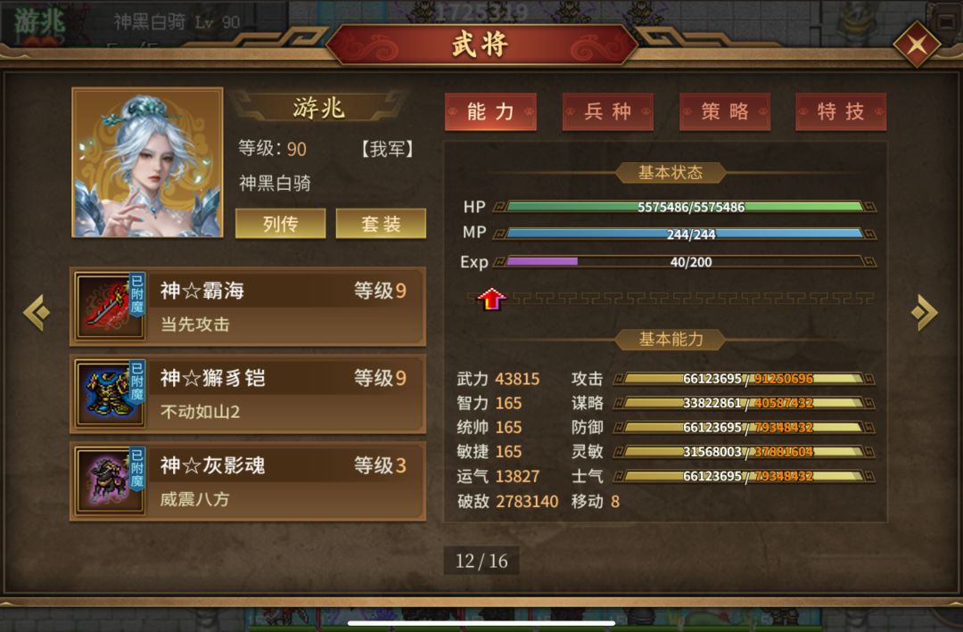 具体到实践中。比如下图是我爬塔的游兆,拥有攻防一体和攻士一体以及唯我独尊。防御和士气受一体影响,智力和敏捷则受唯我影响。前者比后者战场属性高一倍左右。