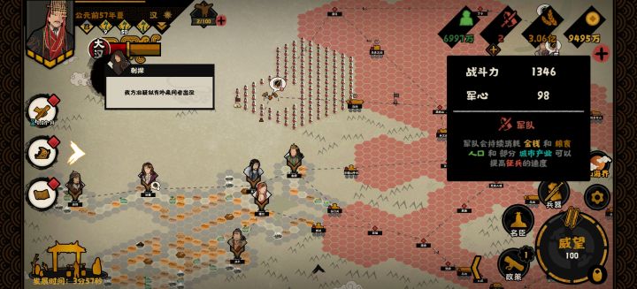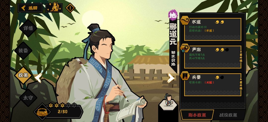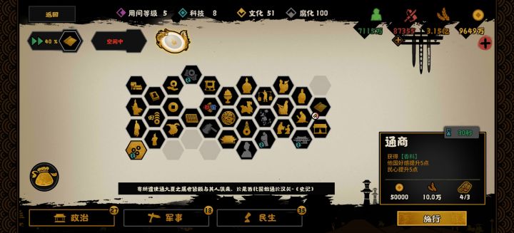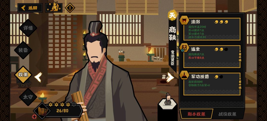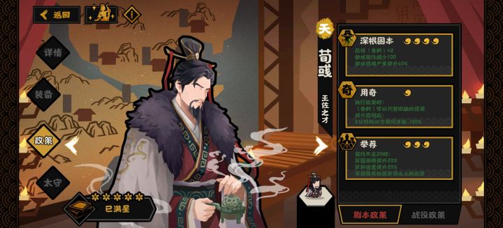 荀彧则是因为香料可以替代特资。尽管在大汉剧本香料也难弄,但总比需要熏衣的时候还要三个丝绸加香料好的多,还有良驹要三匹马合成。政治政策里有下面有个循环政策可以获得香料,需要耗三丝绸。如果开局你选择的盟友是夜郎的话,夜郎特资里有三个香料。但选择夜郎……夜郎脑后生有反骨,90%以上都会反你,南越也不是什么好东西,但南越相对更稳定一点,但南越没有香料。荀彧的毛病是需要低腐化。所以需要在后期察举出卫青才能完全发挥。或者把陆逊换成商鞅。但是除了降腐化,其他的功能都用不太上,所以不如陆逊。或者把贤者为换成郦道元降腐,但是不如鬼谷子契合阵容,而且郦道元作为魏晋南北朝时期的名臣,不一定都有。接下来精彩的来了。
