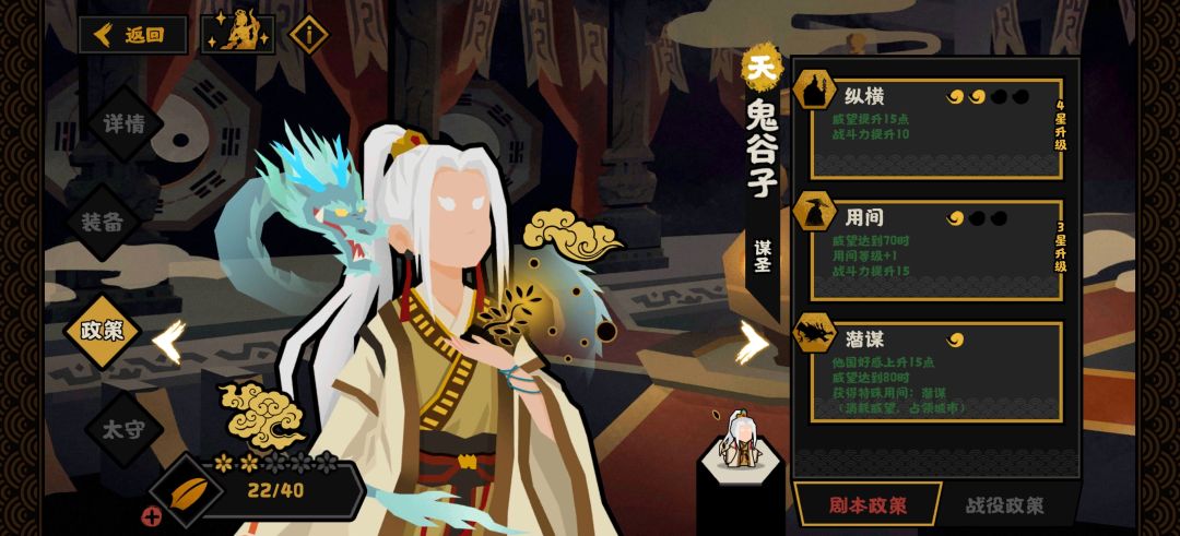 首先鬼谷子。80点威望用潜谋 因为敌方也有用间等级,而且成功率太低了,这个时候回到荀彧二技能用骑效果中战斗胜利后降低敌方100%用间等级,大大提高成功率。