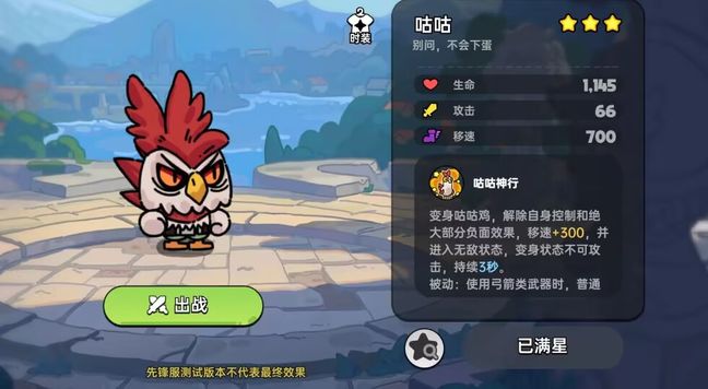 变身咕咕鸡,解除自身控制和绝大部分负面效果,移速+300,并进入无敌状态,变身状态不可攻击,持续3秒。