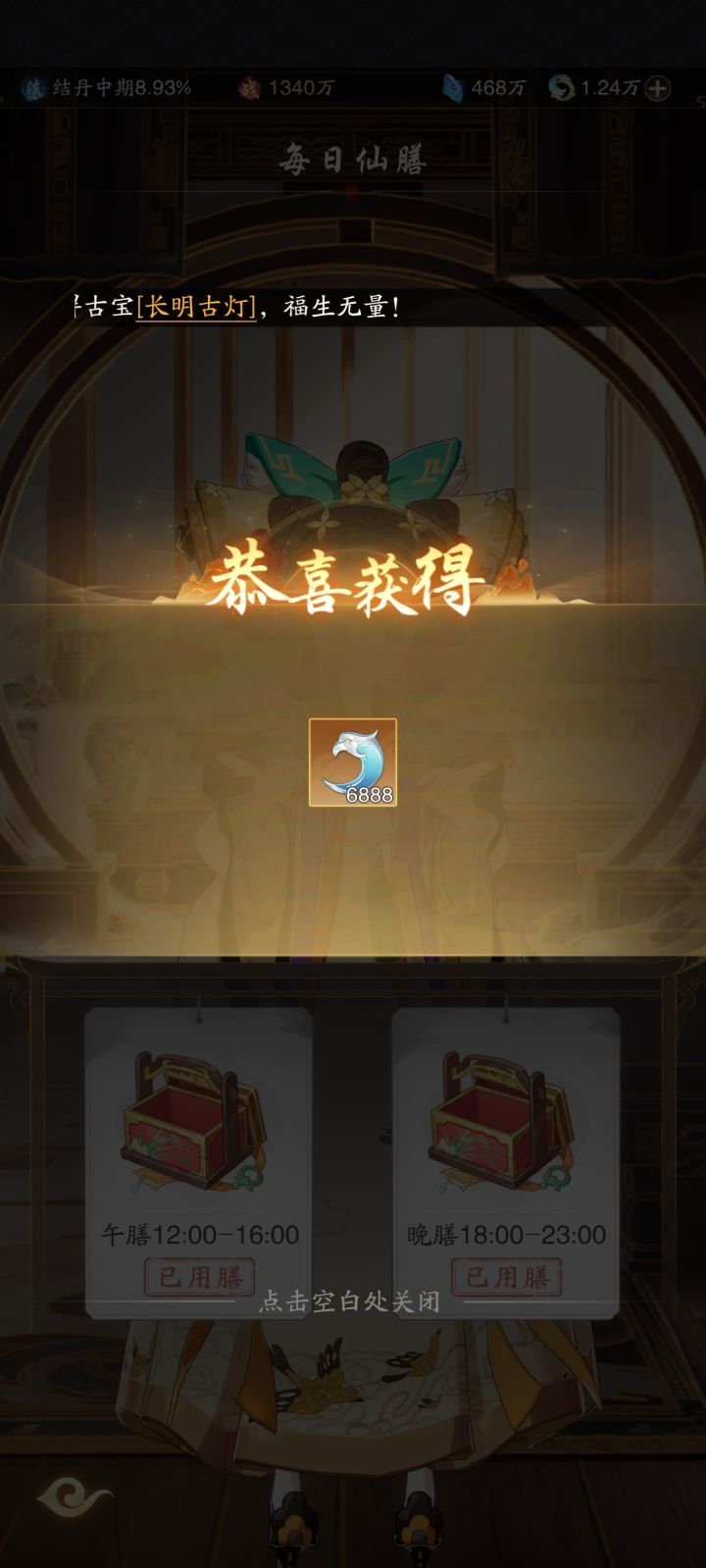第一天抽出了红色仙品古宝,第二天也就是今天,抽出了红色的器灵,第二天的晚上6点,开仙膳开出了6888造化,首充党美美拿下