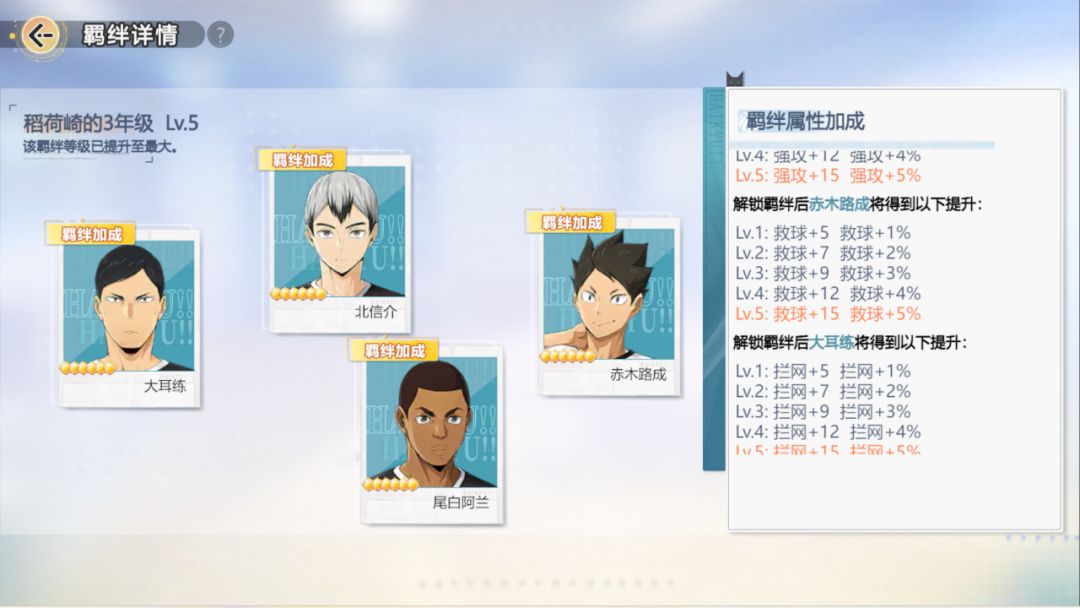 羁绊只有一个解锁羁绊【稻荷崎的三年级】,比较可惜赤木是加的救球,而且羁绊里还有大耳,所以不是很推荐特地升这个羁绊。