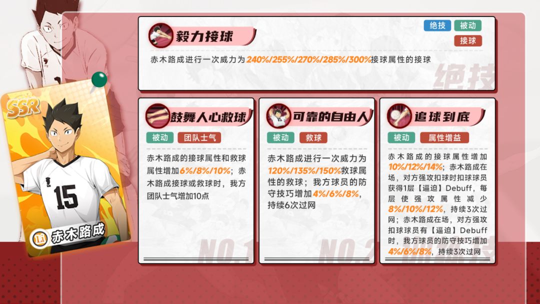 赤木路成的接球属性增加15%;赤木路成在场时,我方后排球员触球未超常发挥时,我方后排球员接球技能的冷却时间减少1次过网;