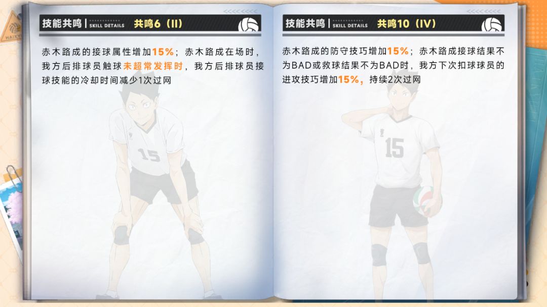 赤木路成的防守技巧增加15%;赤木路成接球结果不为BAD或救球结果不为BAD时,我方下次扣球球员的进攻技巧增加15%,持续2次过网;