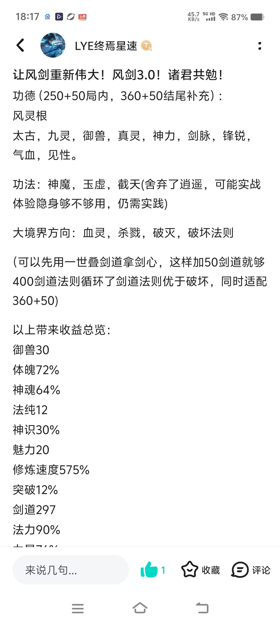 功法:神魔,玉虚,无相(这里舍弃剑书的理由有二第一个就是很明显剑书的神通要你打重击,但剑书本身不给重击,这就很抽象了。第二个就是处于综合考虑五灵剑如果不是带剑心转世的话也是难剑法的,所以也要破坏,而且五灵剑也是更偏重击一点,所以要无相。化神拿到法则之后可以换出剑书这个时候剑书得重击伤害会非常爆炸,化神无相换剑书后多15%突破,重击53%够用)