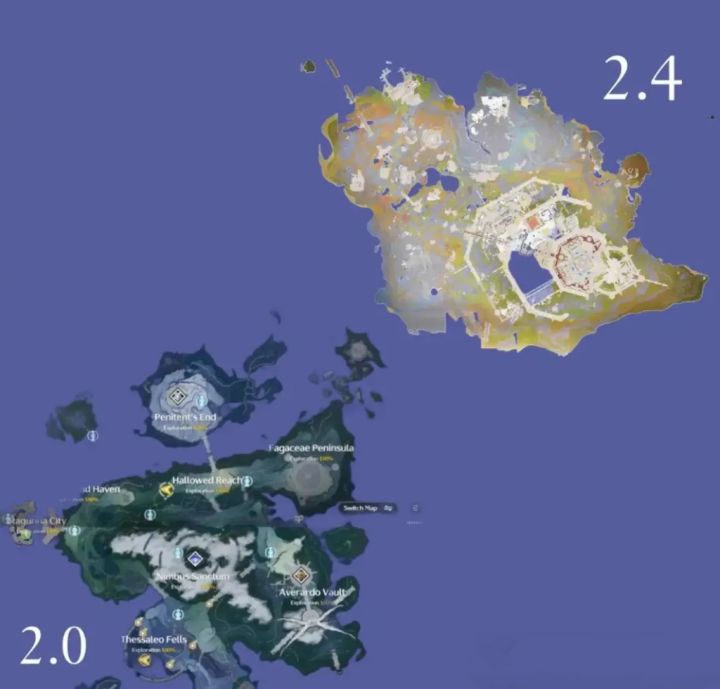 众所周知,在2.4版本,我们将前往一个全新的国家七丘,而露帕也将作为七丘的首个角色与我们见面,可以通过下图看出,七丘的地图与2.0的拉古那相比不逞多让。