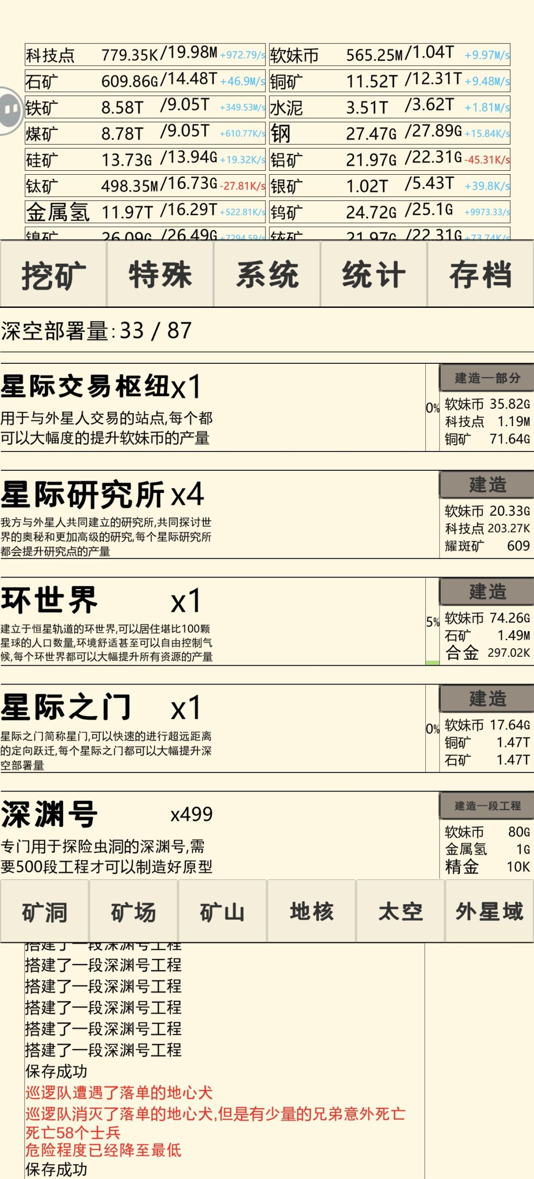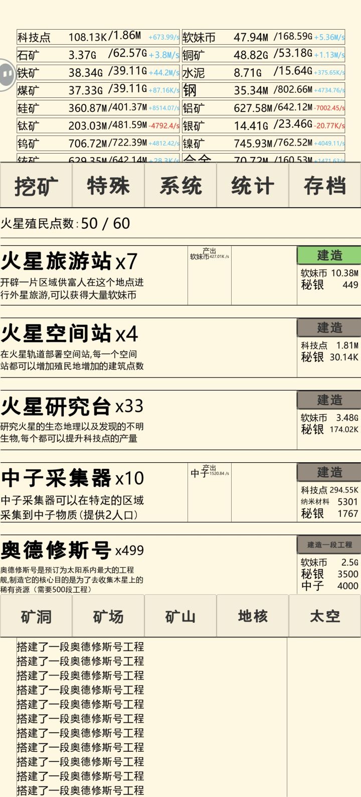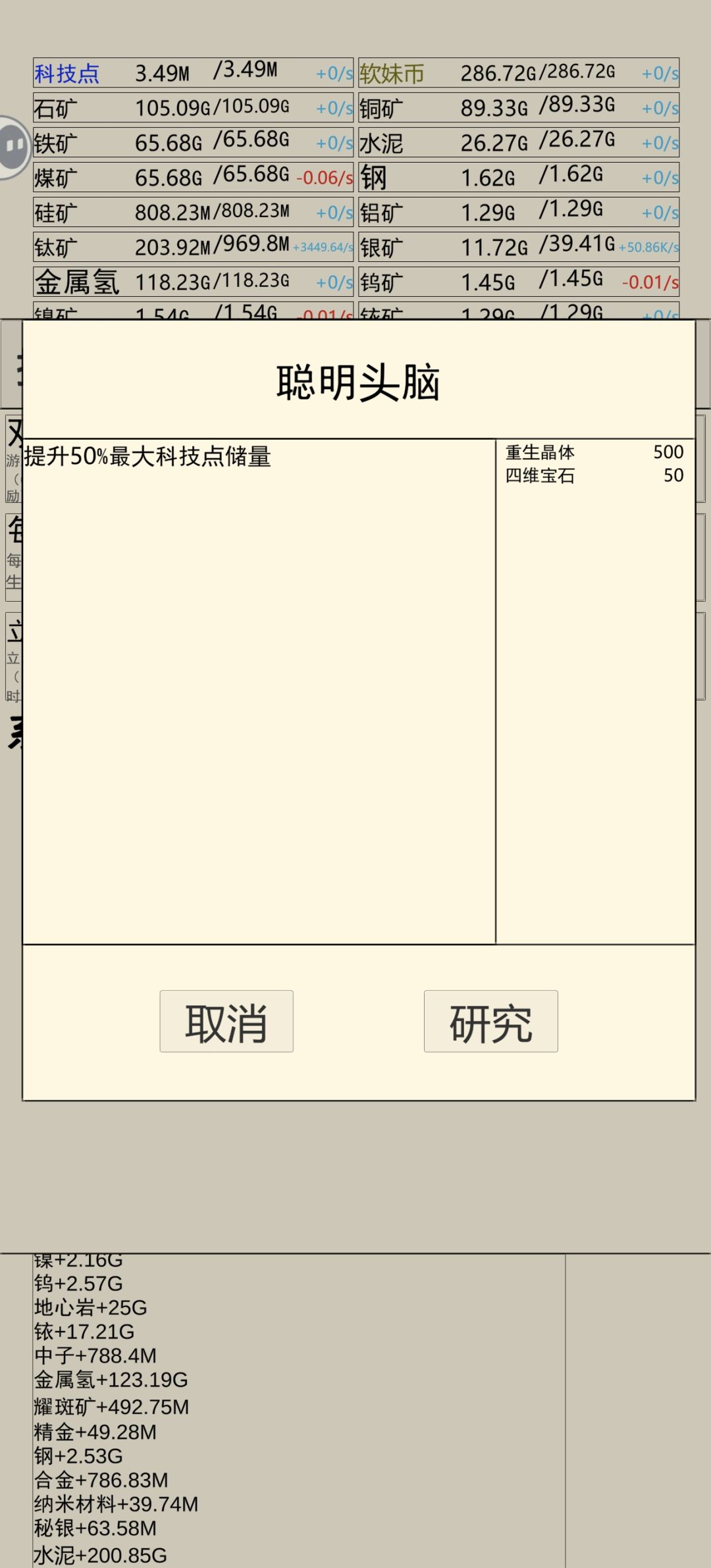想到第六段外星域,得修另一个飞船去木星,然后研究木星科技,但想完整过第六段,必须得有聪明的大脑,研究条件是500重生50四维,不然你的科技点到不了后面的需求,卡住了就得重开,浪费时间,等你满足条件有了聪明的大脑后,可以勉强肝到后期,然后就是漫长的修奇迹过程