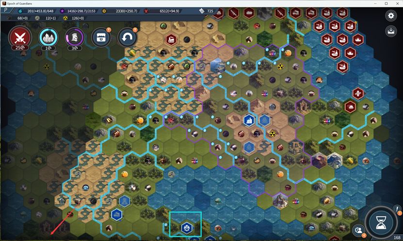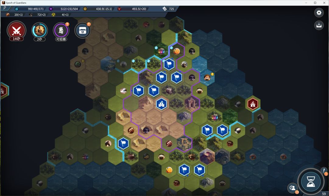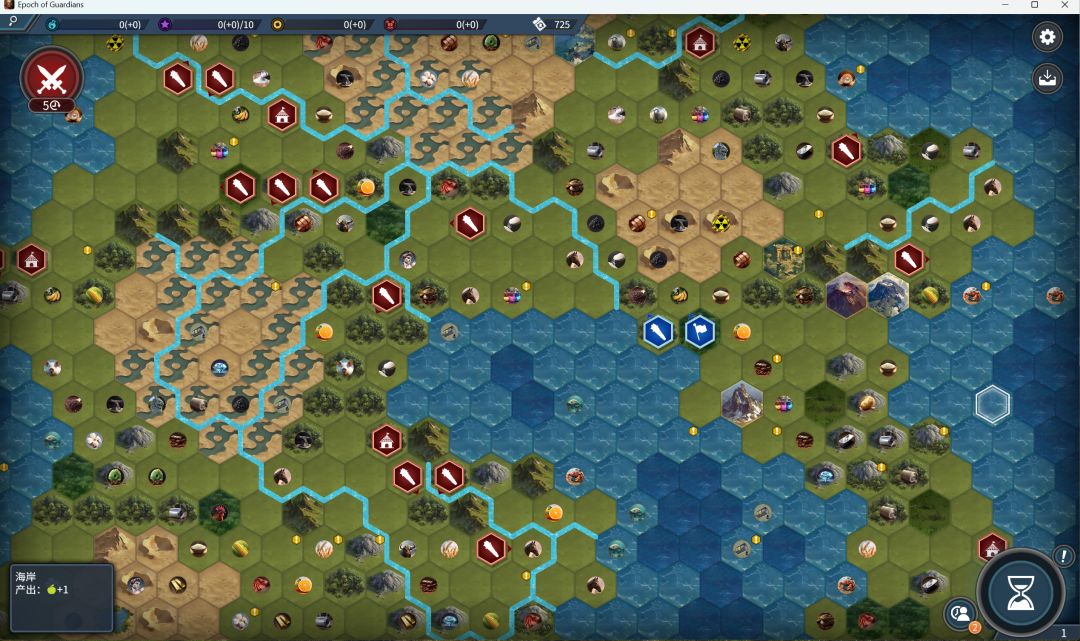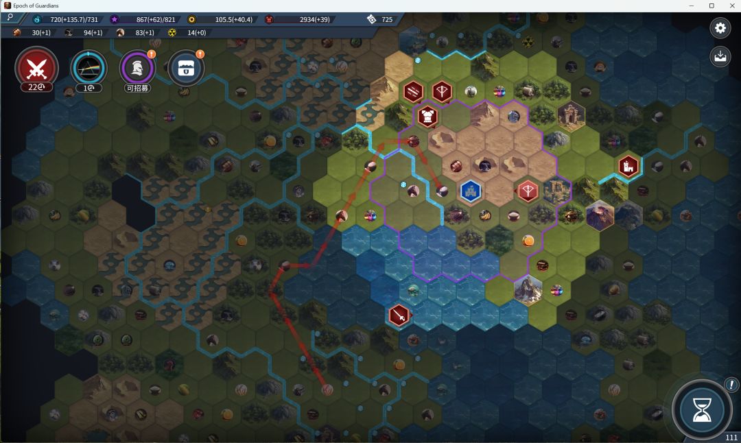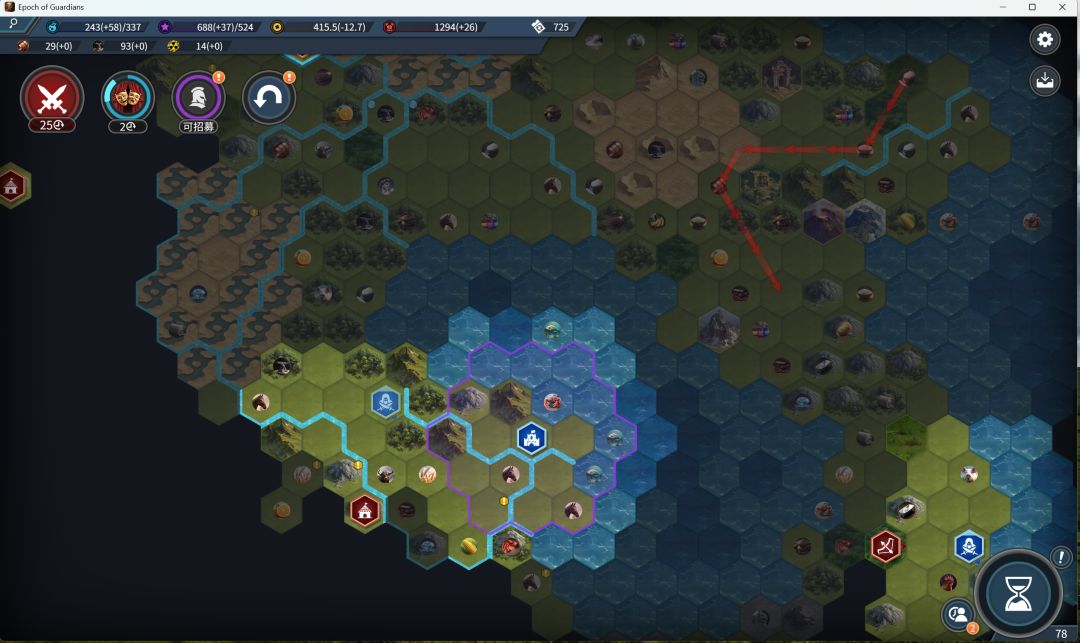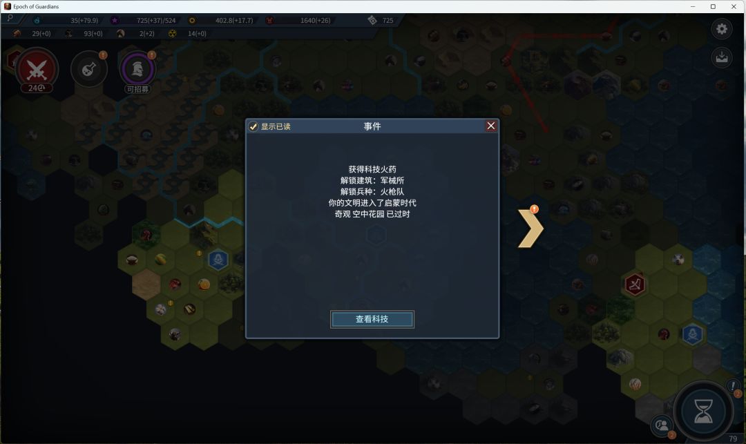 初始三个英雄拿了专研、振兴和鬼斧神工,在带了因循守旧的情况下,开局第三回合就能招第四个英雄,这里拿了峰览。在点出城墙后直接转桨帆船科技线,从而在远古入侵的一回合内就能点出桨帆船。开局派追随者和上帝之鞭分别把右上角和右下角的两个寨子清了并沿途捡下叹号,比较理想的情况下叹号里至少捡到一次军装,寨子拿到两个兵或者粮食,这样可以在第一波入侵时出两艘桨帆船。