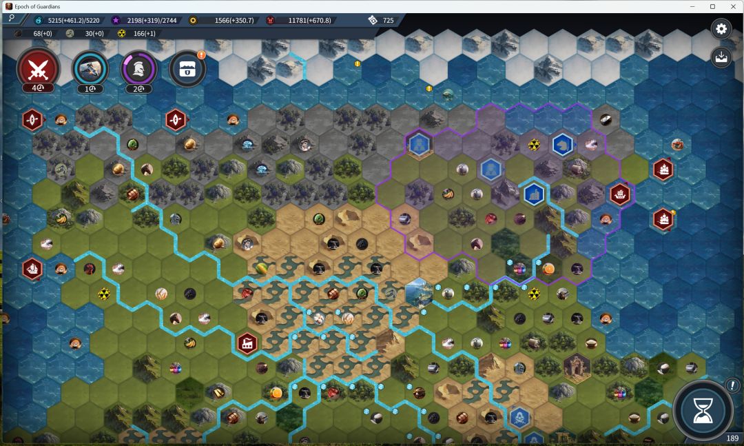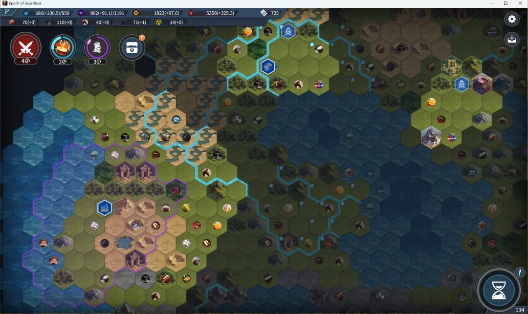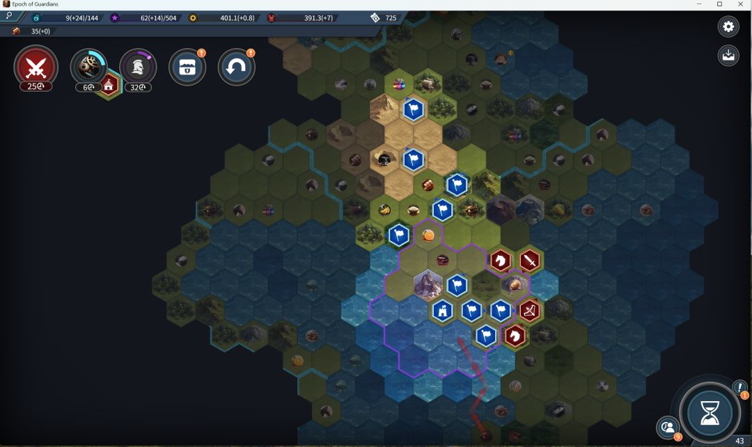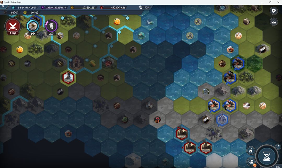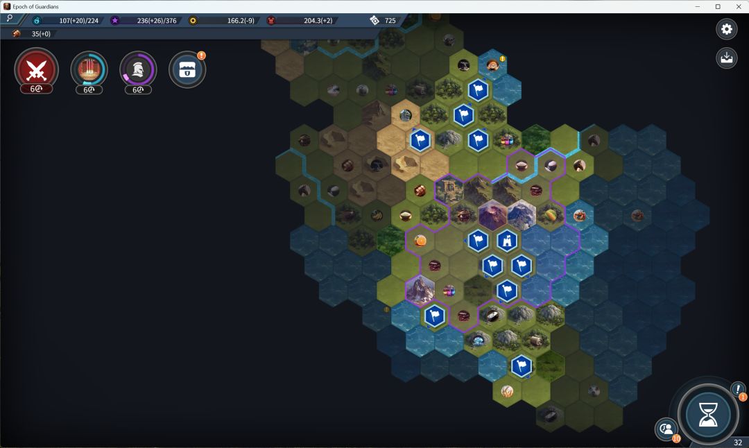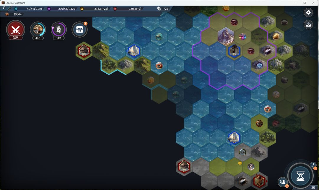 初始三个英雄拿了专研、振兴和鬼斧神工,在带了因循守旧的情况下,开局第三回合就能招第四个英雄,这里拿了峰览。在点出城墙后直接转桨帆船科技线,从而在远古入侵的一回合内就能点出桨帆船。开局派追随者和上帝之鞭分别把右上角和右下角的两个寨子清了并沿途捡下叹号,比较理想的情况下叹号里至少捡到一次军装,寨子拿到两个兵或者粮食,这样可以在第一波入侵时出两艘桨帆船。