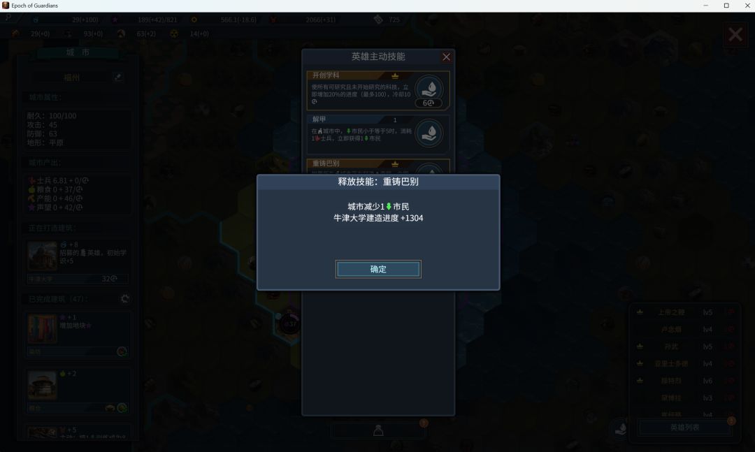 移民的示例如图所示,需要注意的是重新建城会重置所有未完成的建筑进度和积累的产能,因此要避免在这期间修奇观和耗时久的建筑。并且城中建筑和英雄设置的自动释放技能也会被取消,需要重新设置下。另外,因为满意度升得比较快,这里还要控下满意度,以免这期间满意度冲到400送的产能被浪费掉。