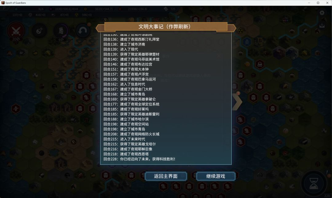 Hello大家好,因为论坛上关于上帝之鞭的帖子比较少,刚好3群的一些小伙伴提供了点独特的思路,就试着打了几次,发现上帝之鞭的强度意外的高,再加上独特的迁都玩法,可玩性还是挺高的。在这里分享一点自己的经验。示例中采用的地图是论坛上的无尽四奇观种子081744382409,自带声望奖励。为了省点券开了无限刷新。先放下结果,228回合跑完的科技,每个时代的奇观基本全建。