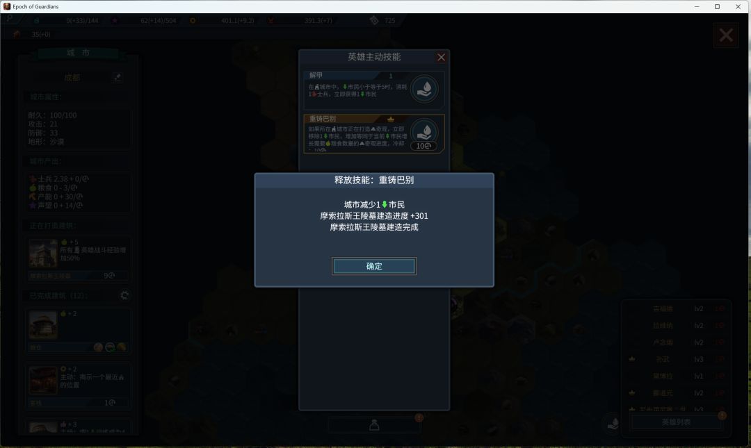 建完城后重铸巴别CD也好了,直接释放,这里有个选择是先敲大金字塔还是莫索拉斯王陵,先造大金字塔的好处是可以拿5个锤子的产能,先造摩索拉斯可以让手下的文艺将刷下等级,点出二级鬼斧神工升华重聚所罗门王把下面的白银转成宝藏。