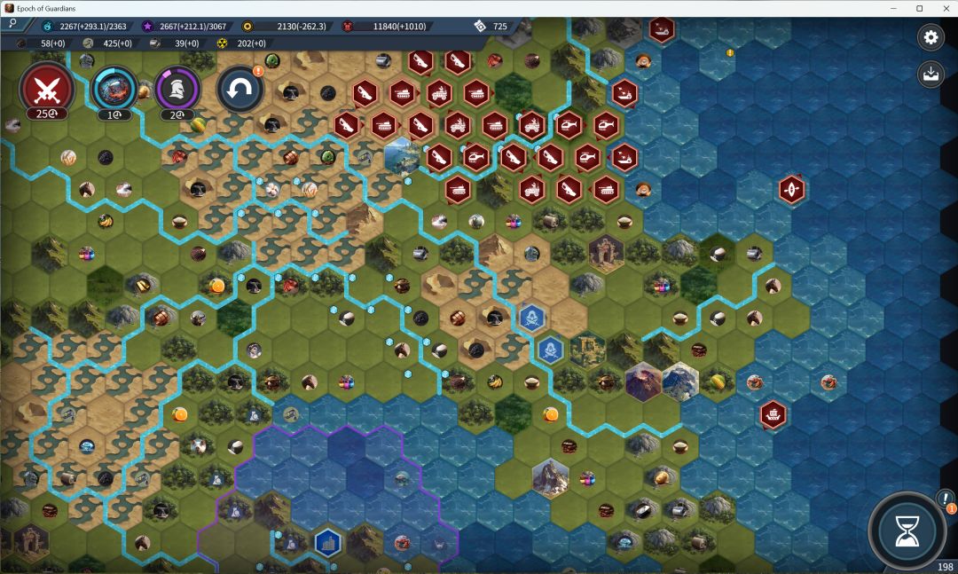 如果这时候铀不太多的话可以把英国舰队刷到内海,然后去图中红框位置建城,在陆地用火箭炮防守。因为原来的城离内海略远,所以没办法把英国海军全部刷到内海里,但因为陆军距离新城位置很远防守压力不大,所以可以集火把外海跑过来的海军干掉。