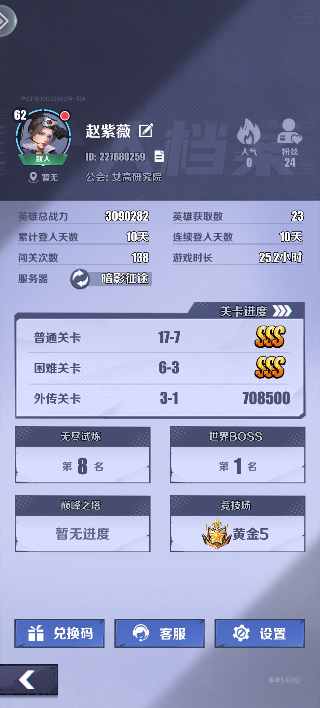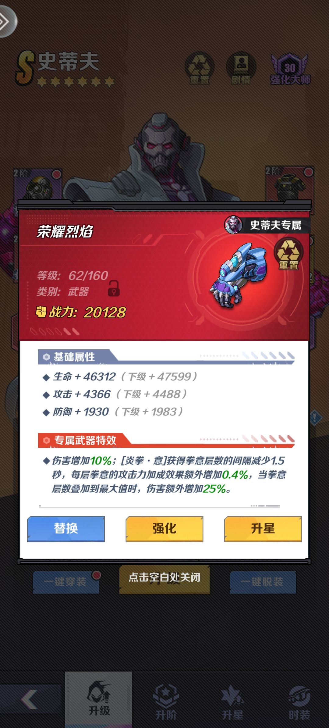 目前本人目前本人刚开服十天,充值了首充6块钱,加上68块钱的特权,运气非常好,第八天的时候就已经六星史蒂夫了,其实史蒂夫这个英雄强度根本就不行,但是这个游戏只要星级高了,紫色照样暴打橙色的,这个号运气非常好,基本出的就是史蒂夫,我30抽必出一个金色,给的是史蒂夫200抽保底选的,也是史蒂夫,150金币换了一个宝箱,剩下的就全是抽出来的,史蒂夫这个英雄群体穿透,然后拳意叠加满了,会有普攻伤害增加和暴击伤害增加,再加上本身的专属武器,也是增加伤害的,所以说如果穿戴暴击套,基础暴击率在17%,局内权益叠加,很快的满了,会增加30%的暴击率,所以说基本20秒之后,史蒂夫就已经伤害成型了,暴击率在47%,如果想打世界boss极限点,可以带一个毒蛇,因为毒蛇首先对首领就有伤害加成,其次它会减抗爆率,其实有一个紫色的英雄叫做奥黛丽,它可以减少物理防御,但是打BOSS必须带一个回血的,因为如果你不带回血的,你还要躲,先不说失误,你有操作躲技能的时间,你不如带个加血的,多打一下,然后其次加血最好是带蔡文姬,因为有加伤害回能,还有加血量特别适合,然后目前是90万战力,目前最高见过一拳18万,然后具体更多的攻略点,点主页吧#无声冲突
