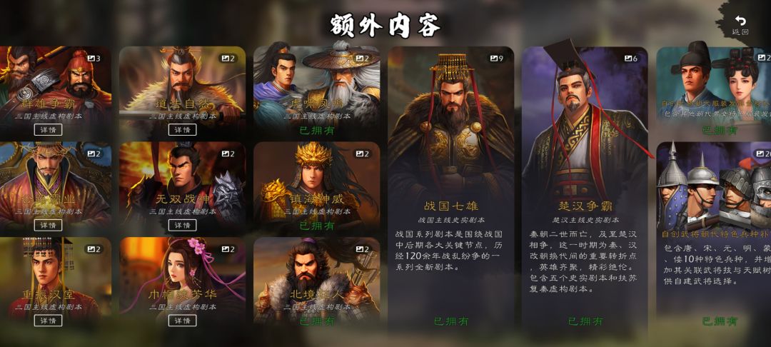虎啸凤鸣里有强度的只有典韦,剩下3个只能拿来守城,镇海神威里有强度的只有孙策跟周瑜,剩下2个只能拿来守城,北境狂人里有强度的只有公孙瓒,剩下3只能拿来守城,目前只有买这3个剧本,因为说真的这些剧本神将比自建武将强不到哪去,所以没有价值,还不如直接自建武将来的实在,自建武将自从出了新兵种,剧本神将是真的没必要买了,因为没有自建武将好用,这是个人观点,当然有人是奔剧本去的,有人奔立绘和武将去的,我买剧本将就是奔立绘去的,其他没啥用,剧本只要玩下去都是一个样,跟史实本没区别的,还有这个游戏目前的玩法就是战斗,内政基本是摆设的,基本没用过内政,内政是这个游戏的硬伤,只能这么说,希望内政可以改动变成有用的,然后希望可以出个天气系统