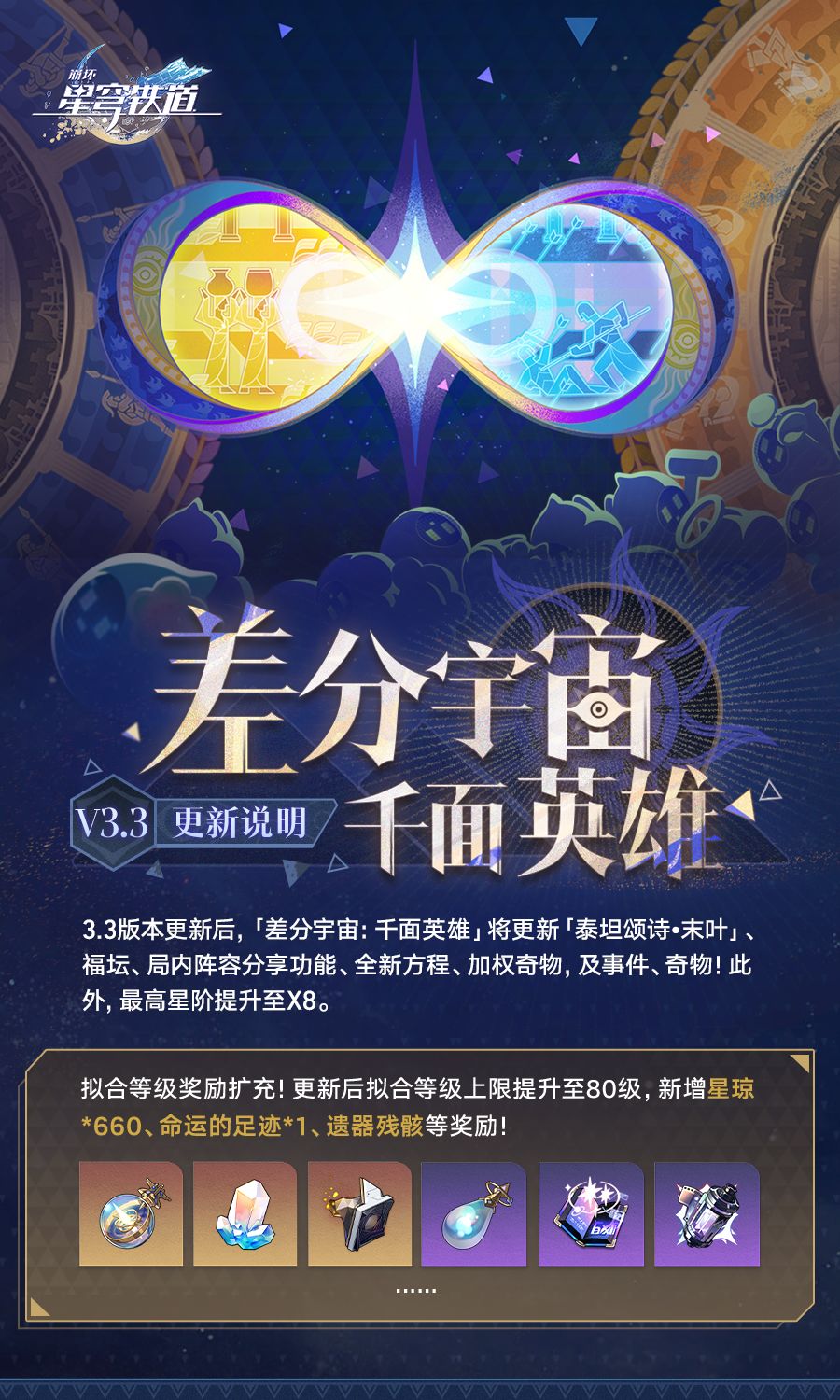 3.3版本更新后,「差分宇宙:千面英雄」将更新「泰坦颂诗•末叶」、福坛、局内阵容分享功能、全新方程、加权奇物,及事件、奇物!此外,最高星阶提升至X8。