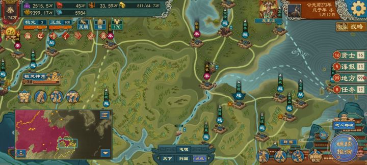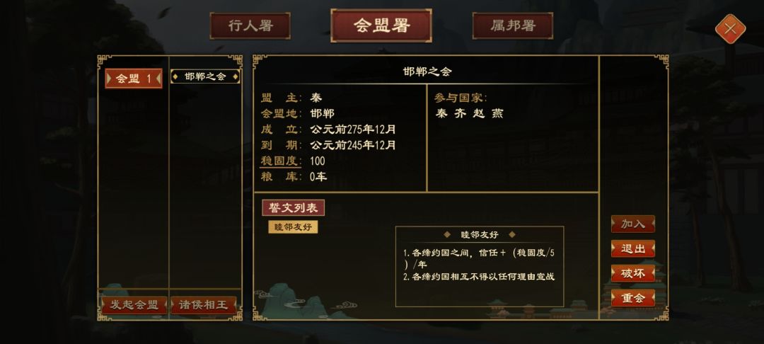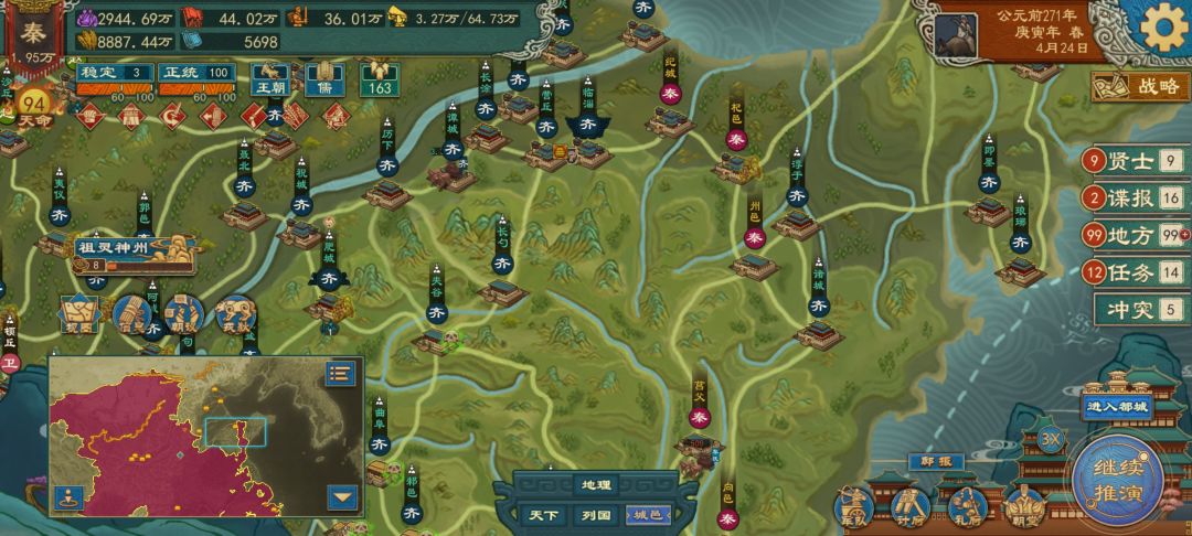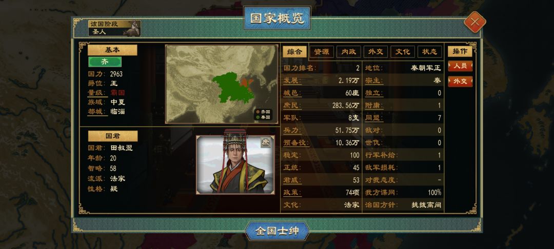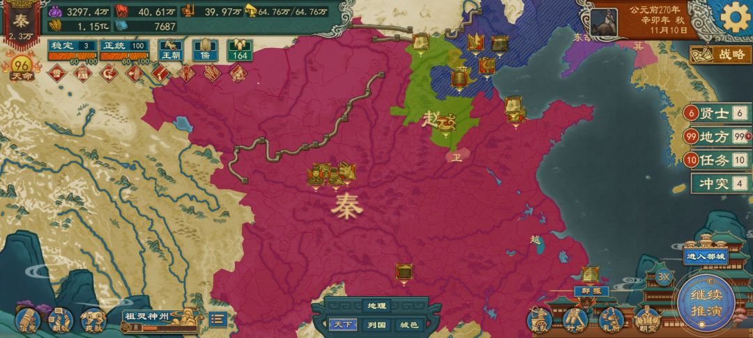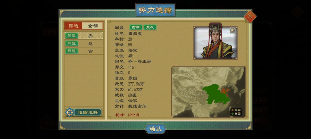 然后然后“断交”“宣战”,宣战成功直接打他打你其他地方管都不用管,打下来直接灭,三年直接灭了三个加起来百万大军的国家,越、楚、齐。