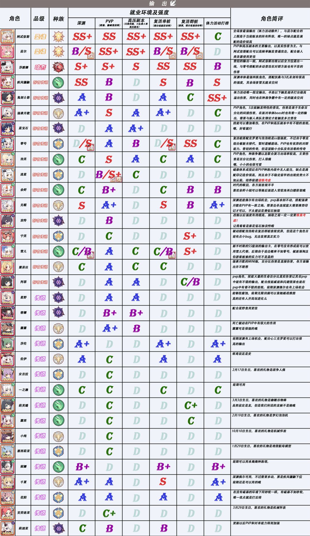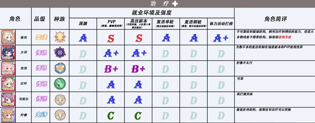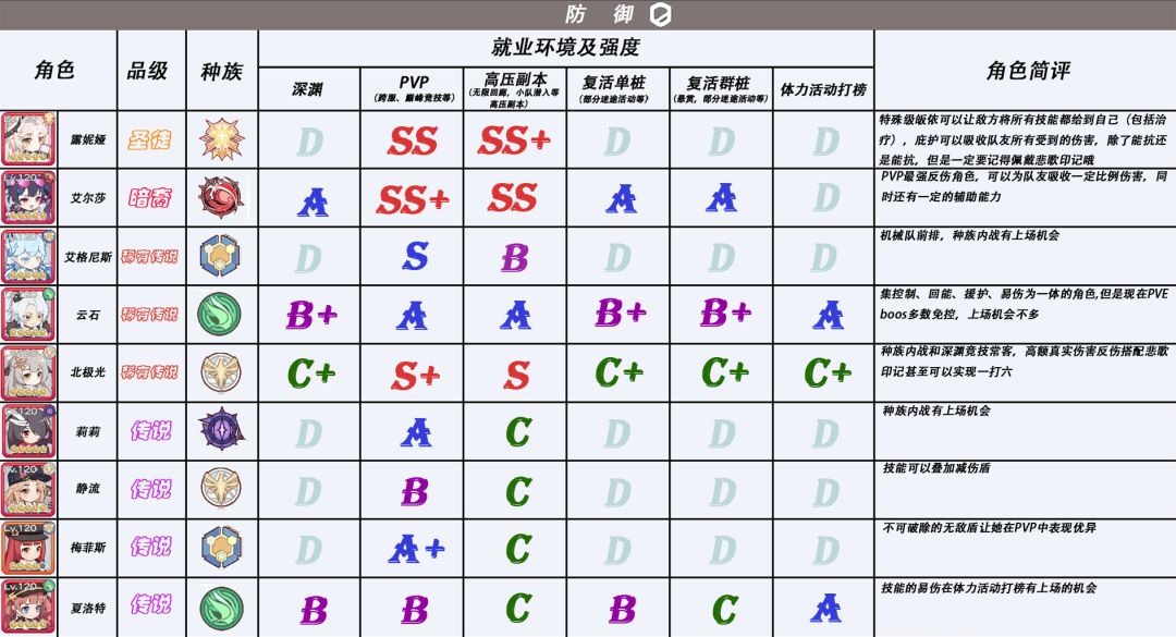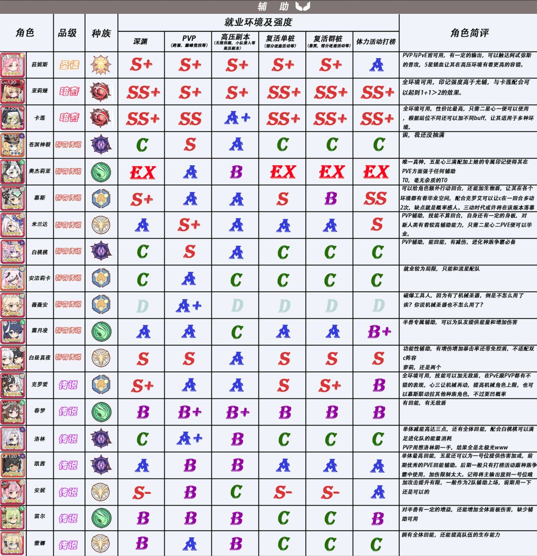 该图表一共将角色强度分为了七级:EX,SS,S,A,B,C,D。EX等级,目前只有一位角色能够胜任这个等级,EX等级的评定标准就是——强,毫无争议的强🤓👍🏻。而SS级的评分标准中,一般SS+在同职业同环境下最多只有一位,辅助等特殊职业除外,剩下的角色便根据自身情况依次排序了。再特别说明一下D等级的评分,这个等级只有两种情况:一种是玩法确实有待开发,出场次数寥寥无几;另一种情况就是,该角色我了解的实在过少,暂定D级。 某些角色会有两种等级,这说明该角色只有在与另一角色同时出场时才会到达该等级。