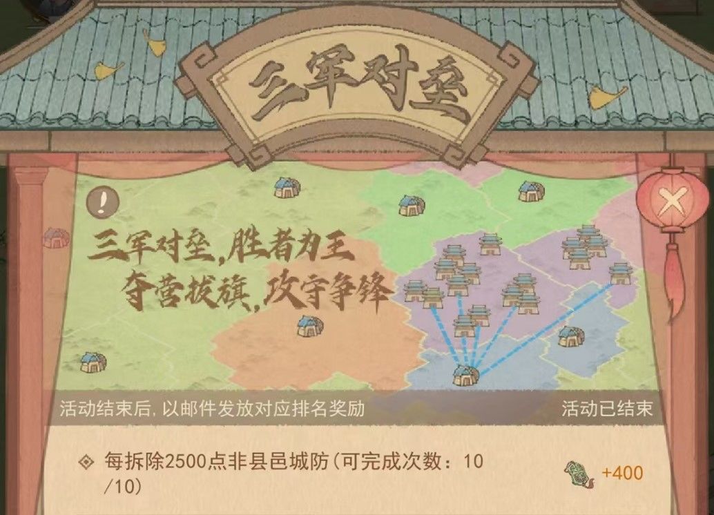 ①此阶段理想状态分三部分,一支小队着重拦截/守卫军旗,剩余部分分为两队前往两座瓮城,能获得首占最佳,不能的话以消磨城防、干扰敌方进攻节奏(进攻有兵的敌方县邑)得分为主