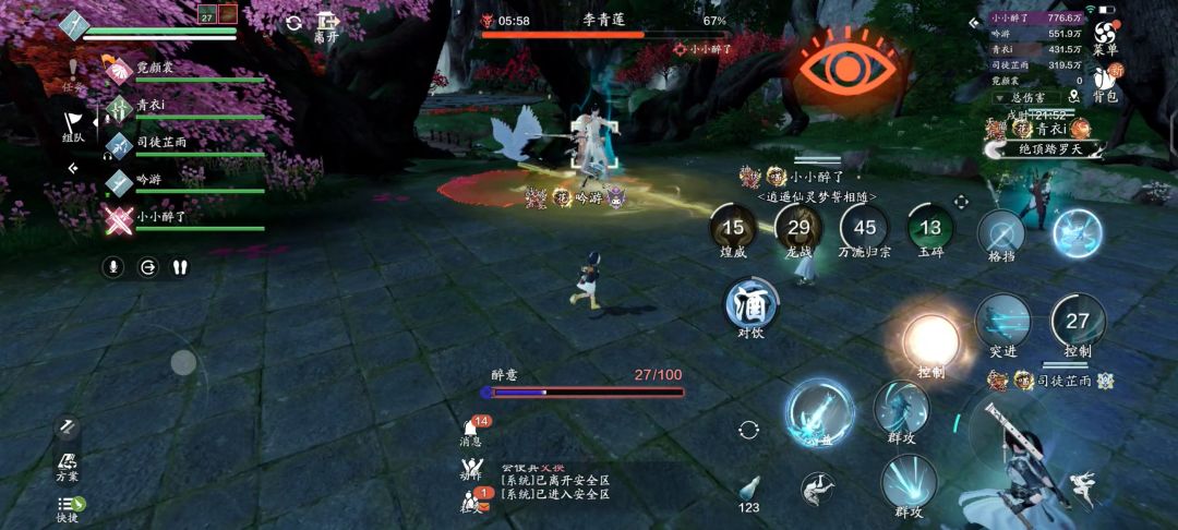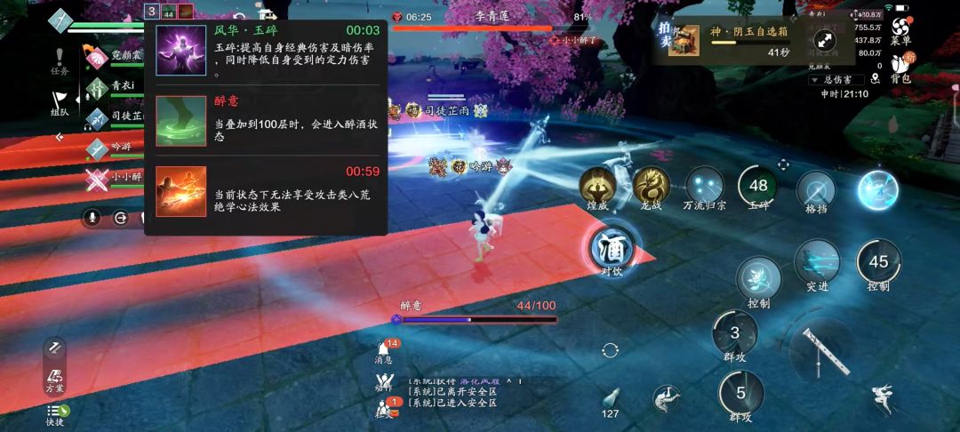 当“醉意”累积到100层后,各位少侠会进入“醉酒”状态,移动速度减慢。