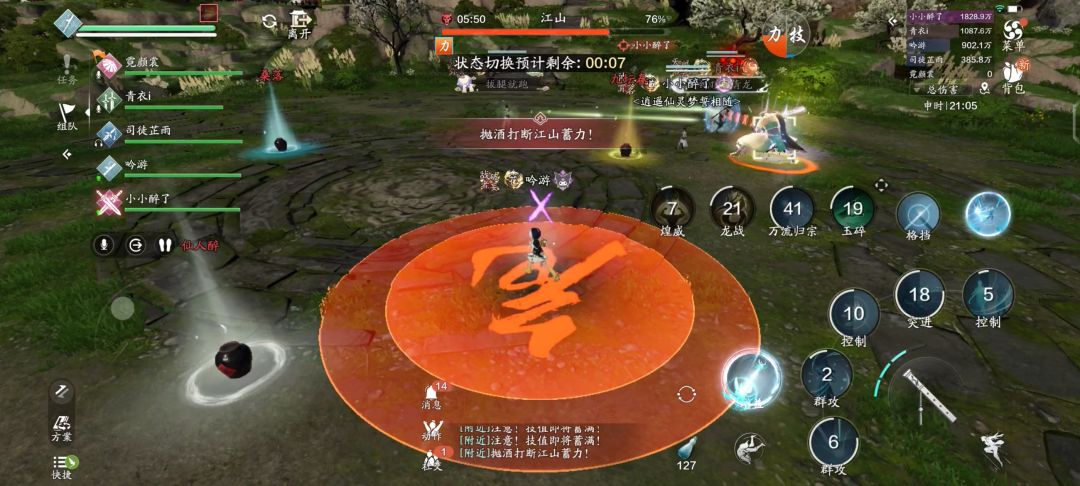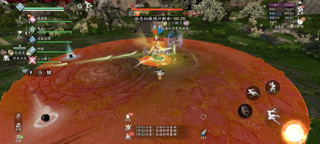 江山随机点名一位少侠,蓄力后发动进攻。大家可向首领扔酒坛打断技能。建议当首领处于“力形态”,身泛黄光时,扔【桑落】;当首领处于“技形态”,身泛蓝光时,扔【九坛春】被点名的少侠脚下会出现“危字警示圈”。