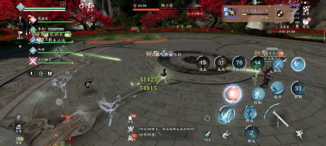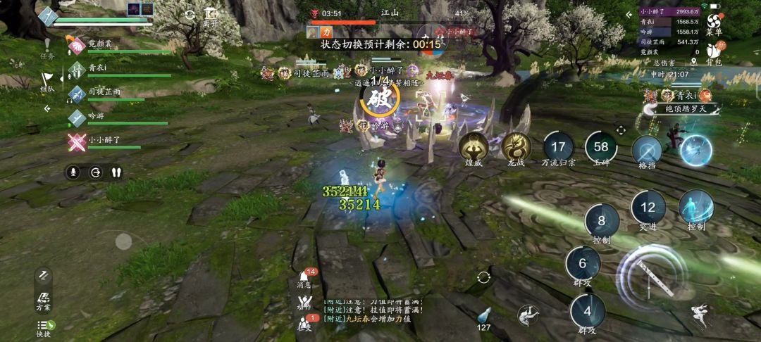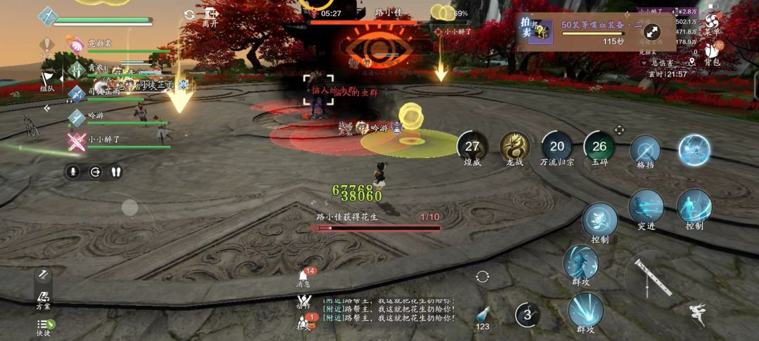 江山血量到达60%以下时,大家要注意首领血条下的状态显示,江山会获得“醉酒”状态,其技能朝向会频繁变化。这个就需要考验各位少侠的操作了,除承伤和近战输出外,其余队员尽量远离首领。