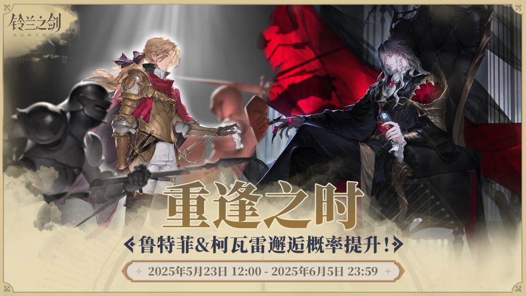 「重逢之时」限时邂逅将于 2025/05/23 12:00 - 2025/06/05 23:59 开启,传说角色「鲁特菲」、「柯瓦雷」邂逅获取概率将大幅提升!