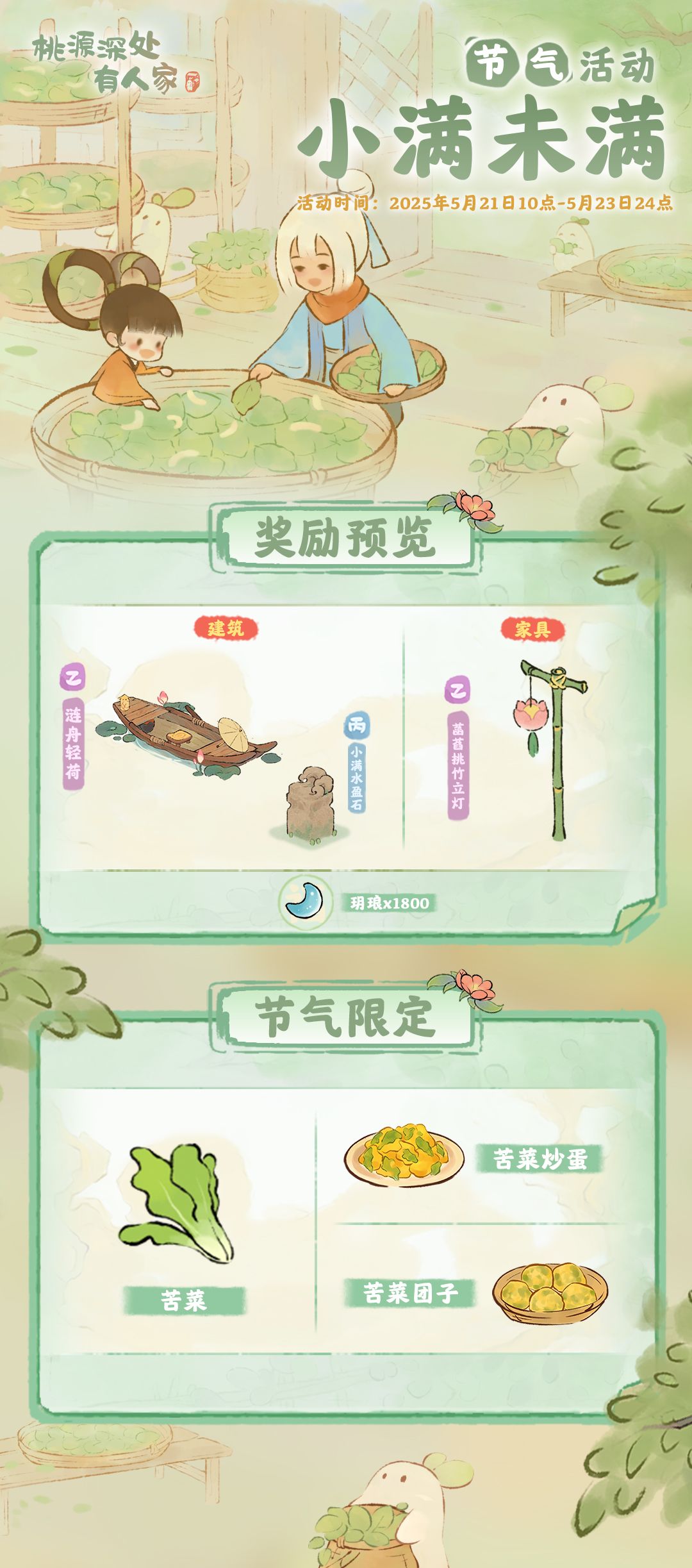 各位萝萝山山民好呀!小满节气将至,山野间的苦菜正长势喜人。此时节素有 “吃苦尝鲜” 的习俗,苦菜嫩芽拌上酱汁的独特风味,正是节气里的限定美好~今日小花便为大家带来小满节气活动预告萝!