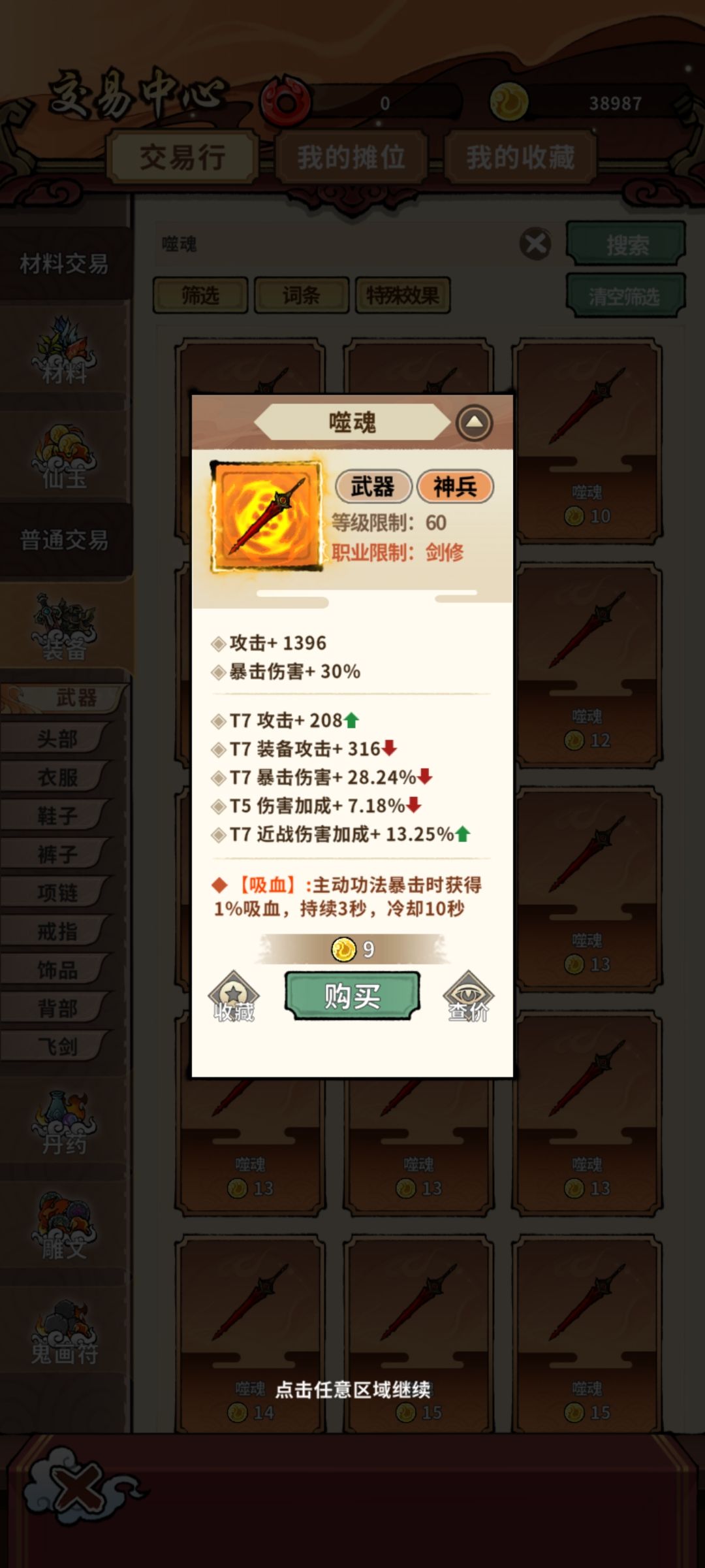 这把武器自带五个词条每个都是一顶一的强,还有自带的吸血特效减少生存压力,建议直接强化满,强化石仙璃晶一百个起购,大概27玉一百个强化满+12大概要30个仙璃+19仙玉,+6只需要9个仙璃不用仙玉。想当初刚开服玉价是现在的十多倍的时候噬魂还一度能卖四五百玉,后面一两个星期都能稳定一两百,不要觉得现在它便宜是垃圾,我从一开始就认为它是仅次于t8装备攻击霸王的武器。