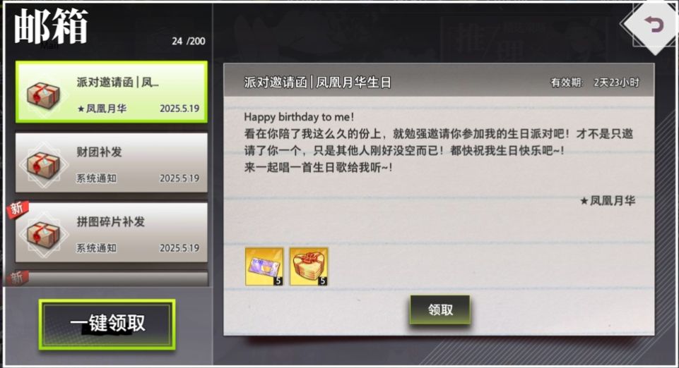 今天是凤凰家家主,凤凰月华的生日,祝生日快乐!5月19日-5月22日登录游戏可领取凤凰月华生日邮件奖励!