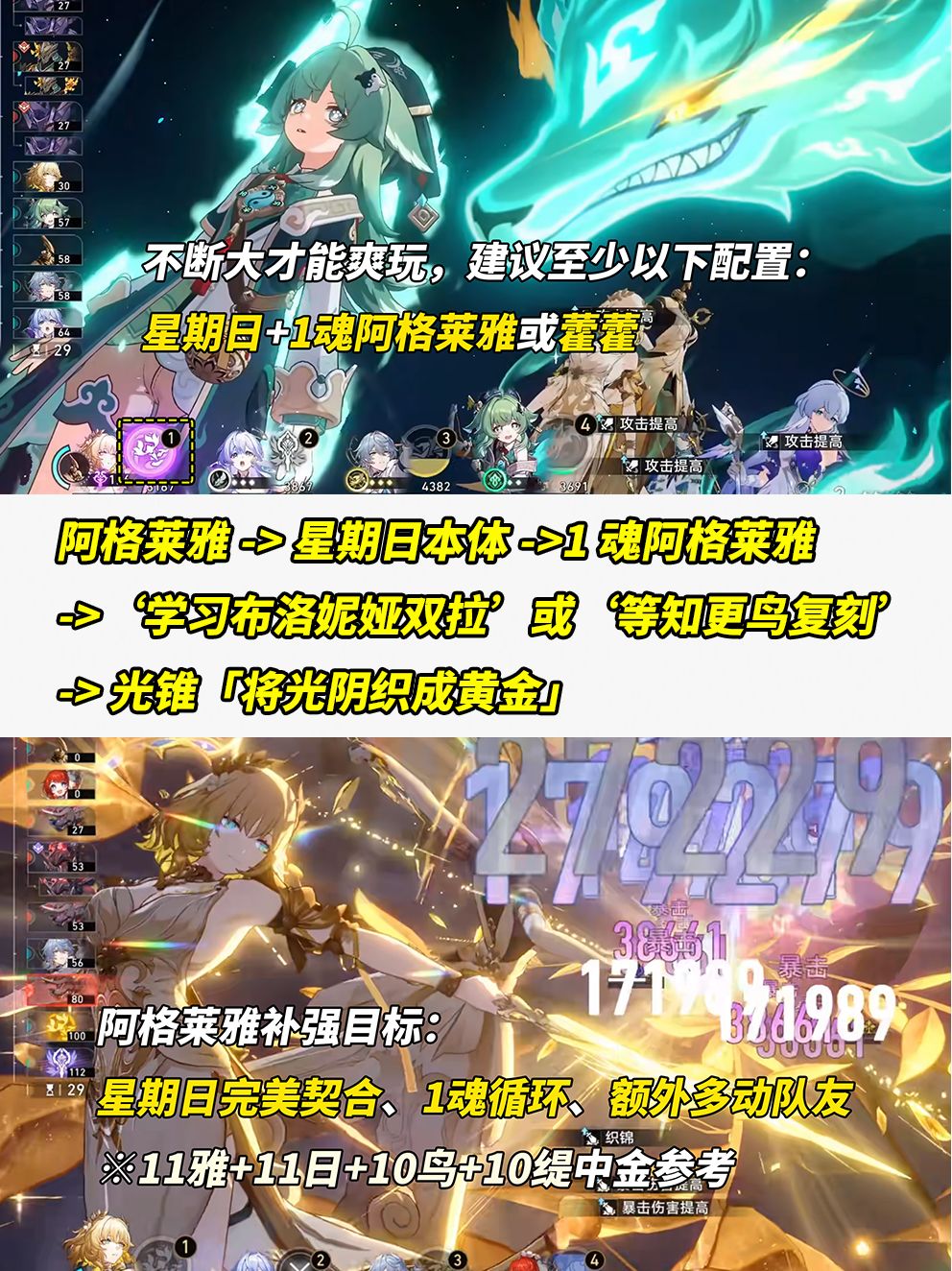 维持阿格莱雅高自拐数值,刚需维持终结技状态。因此问题答案很明确,星期日基本必选,其次1魂阿格莱雅与藿藿至少拥有其一。
